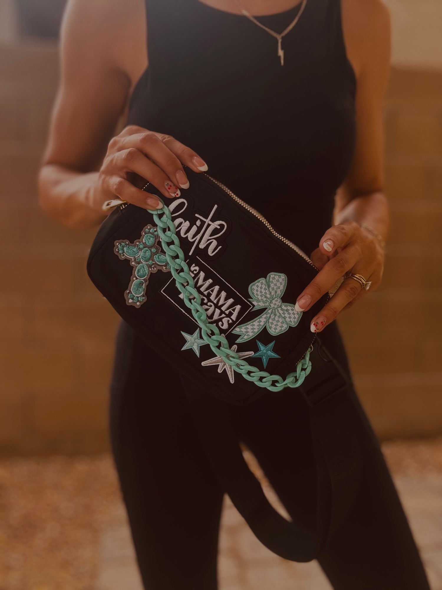 Our sport belt bags are small batch. They are a standard sport bum nylon material. They have the adjustable belt bag strap. The have multiple pockets inside and and outer zip pocket on the backside of the bag.