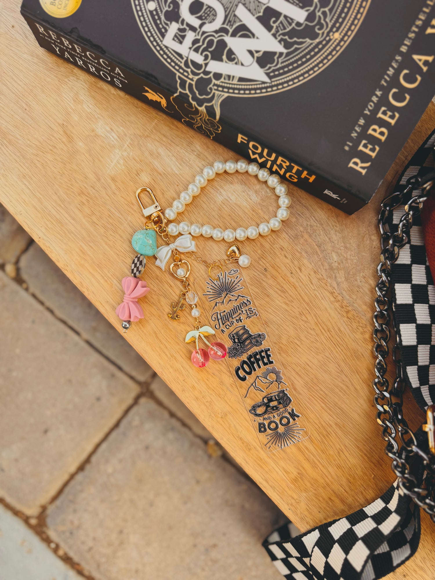 Charm a book with the book charm hanging out of the book with the bookmark