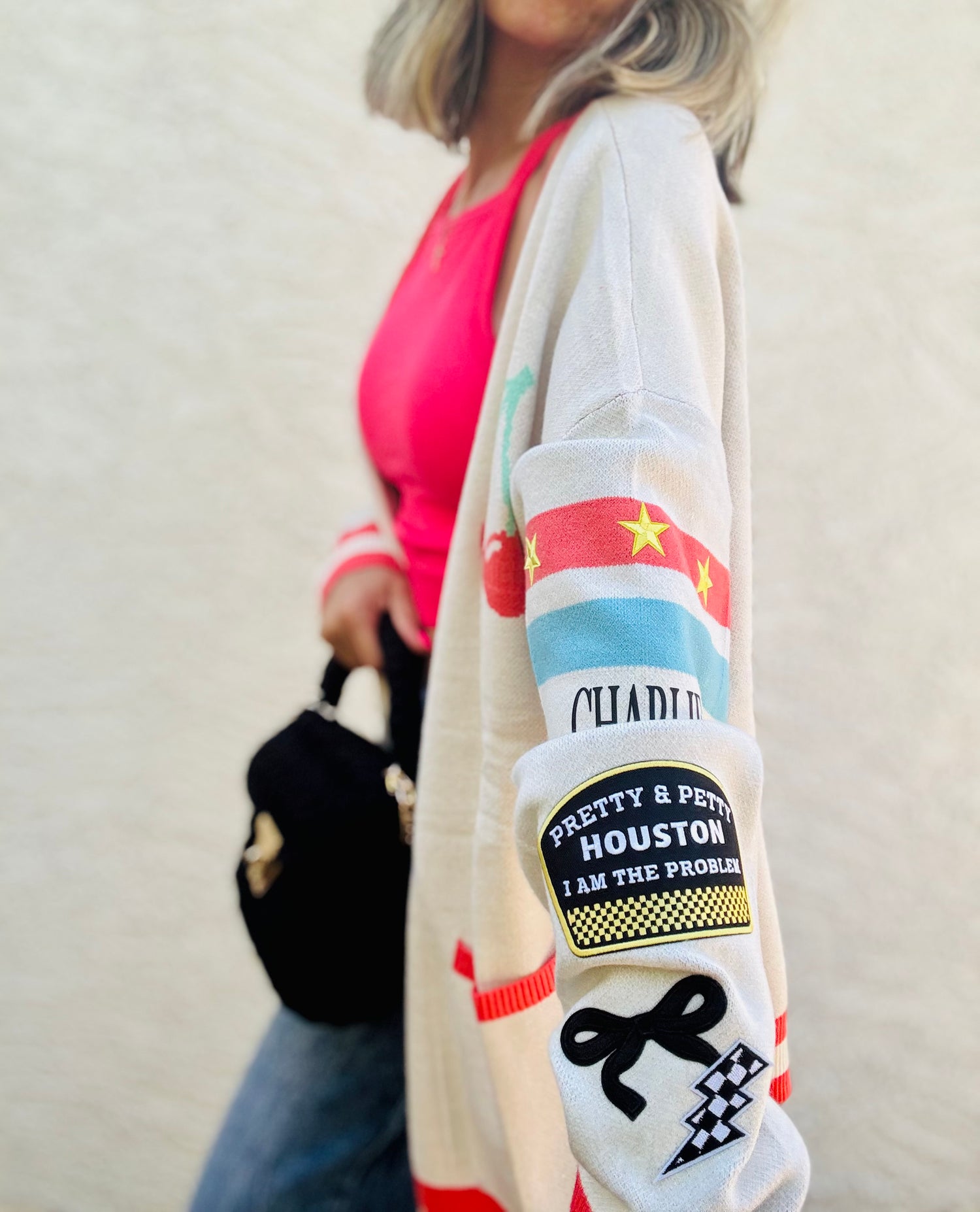 BBH-CHERRY BOMBER CARDIGAN + pretty petty Houston I’m the problem + CM CO. babes
