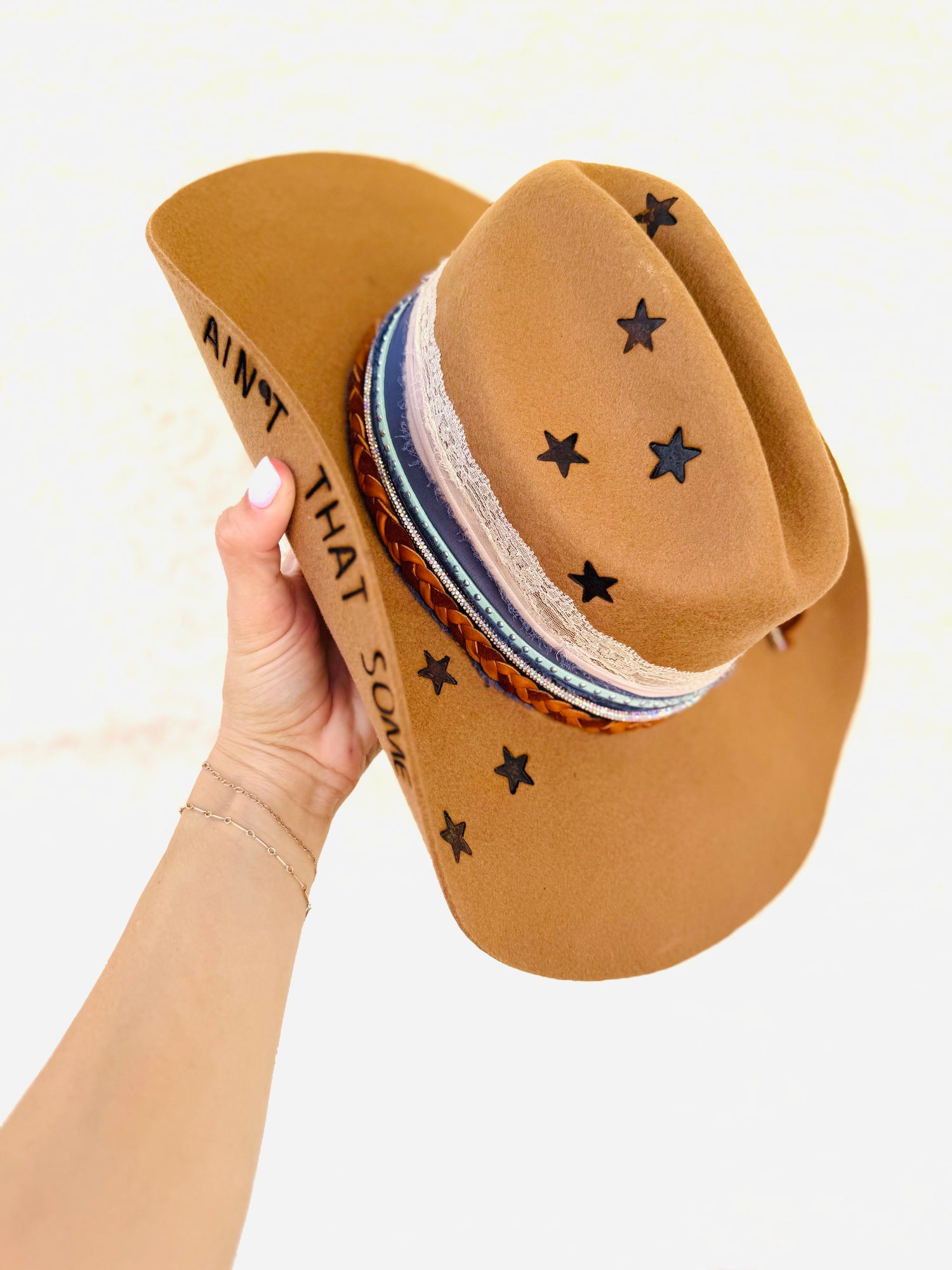 One of a kind. Genuine felt cowgirl brim with one of a kind details, such as cascading star, branding, and genuine locally source elk hide, braided hat band.