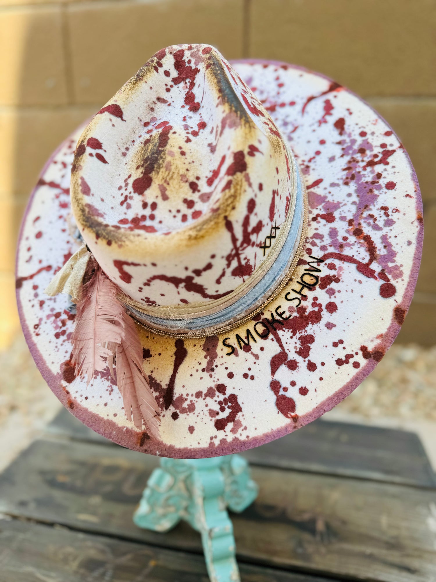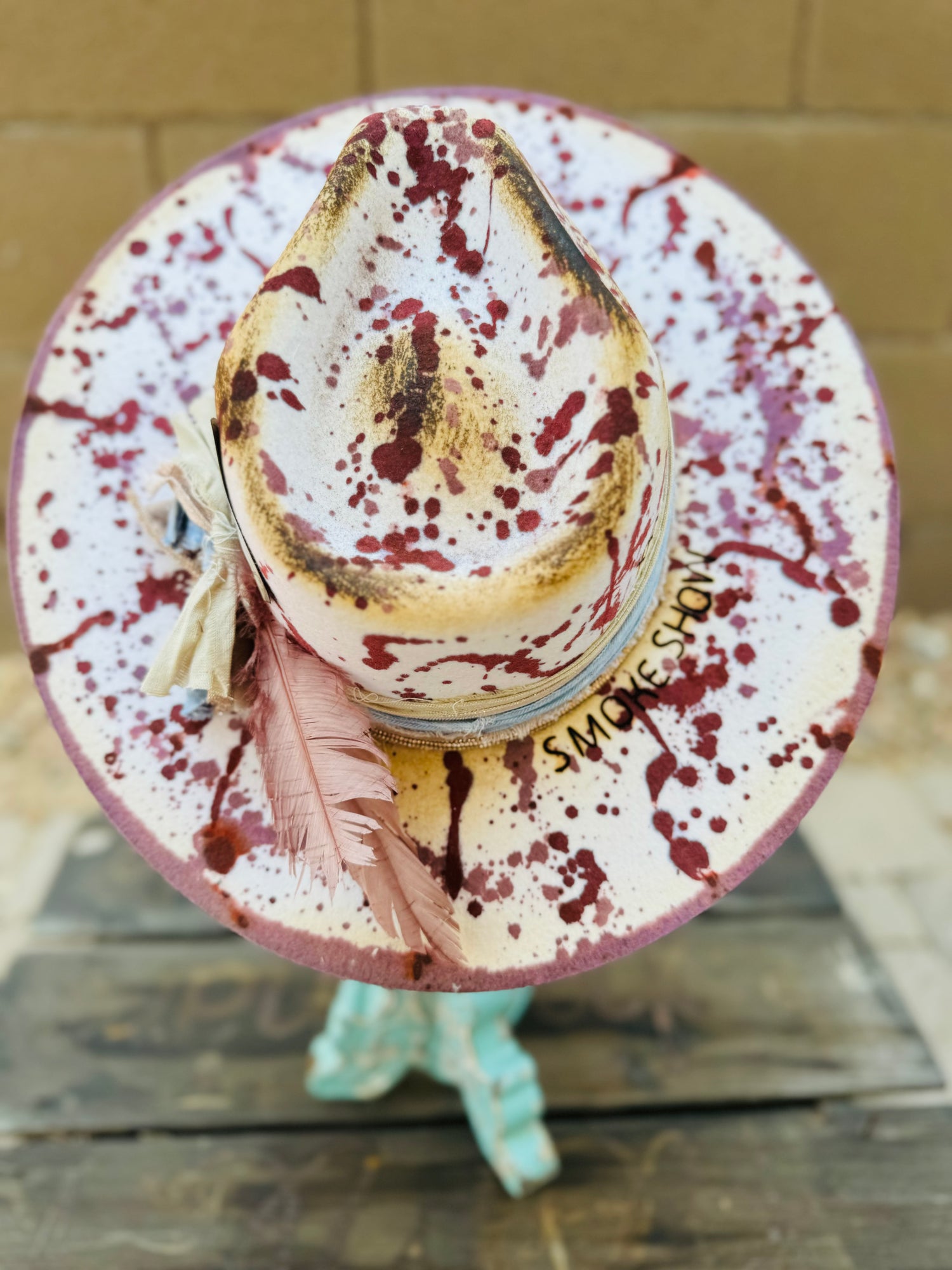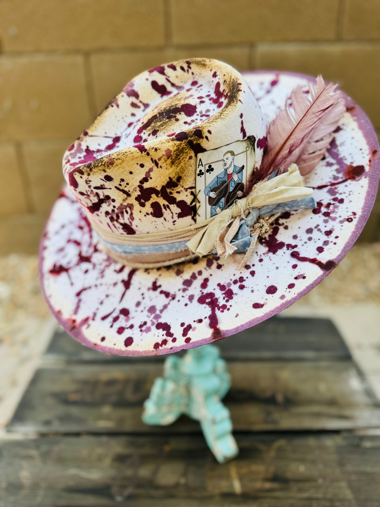 this ivory color felt hat has been hand dyed with a metallic dye and burn distressing to give it a unique one of a kind splatter look. It has a hand burned smokeshow lyric inspired by Zach Bryan with a limited edition, Zach Brian, playing card and other vintage accessories.