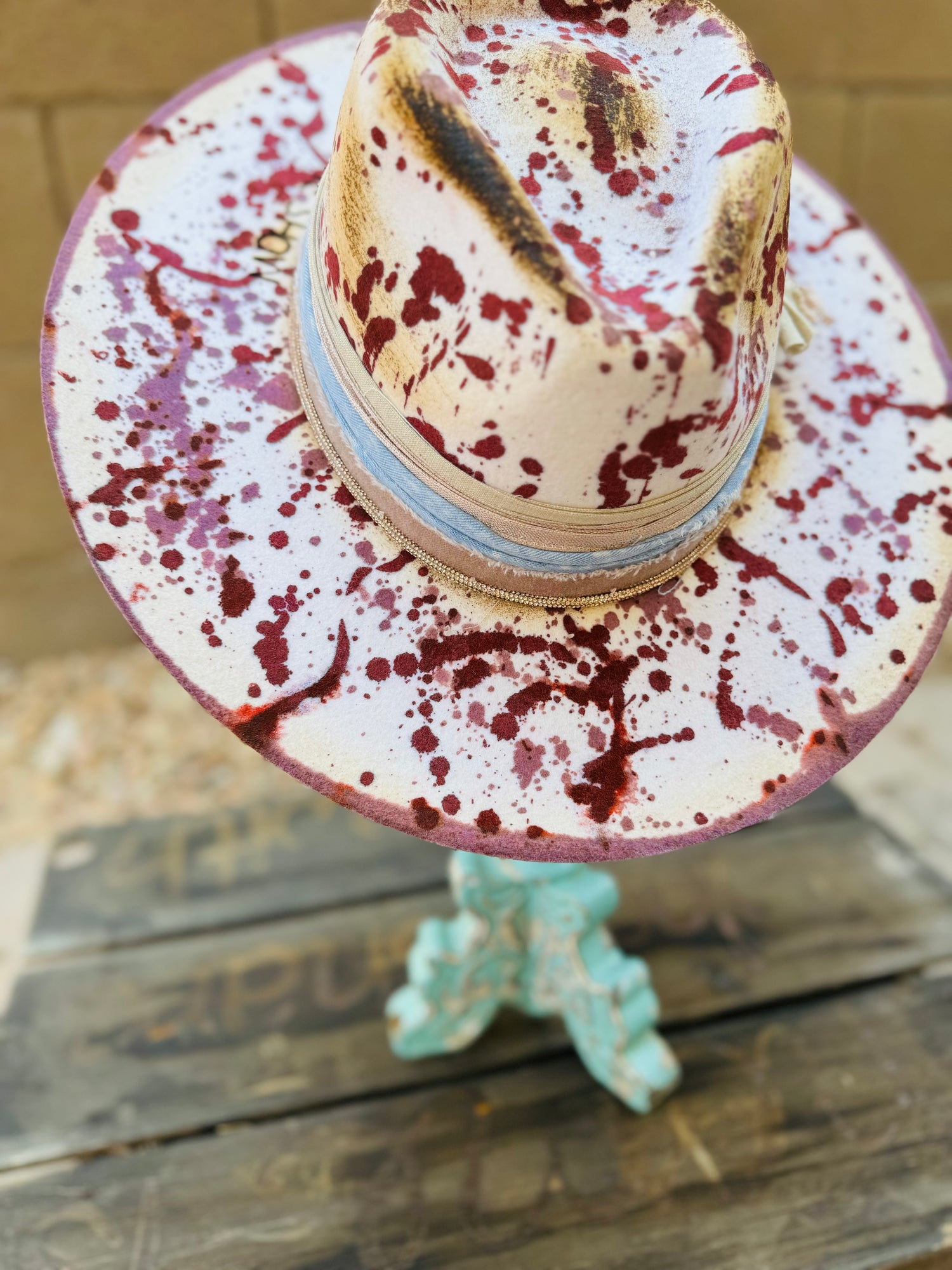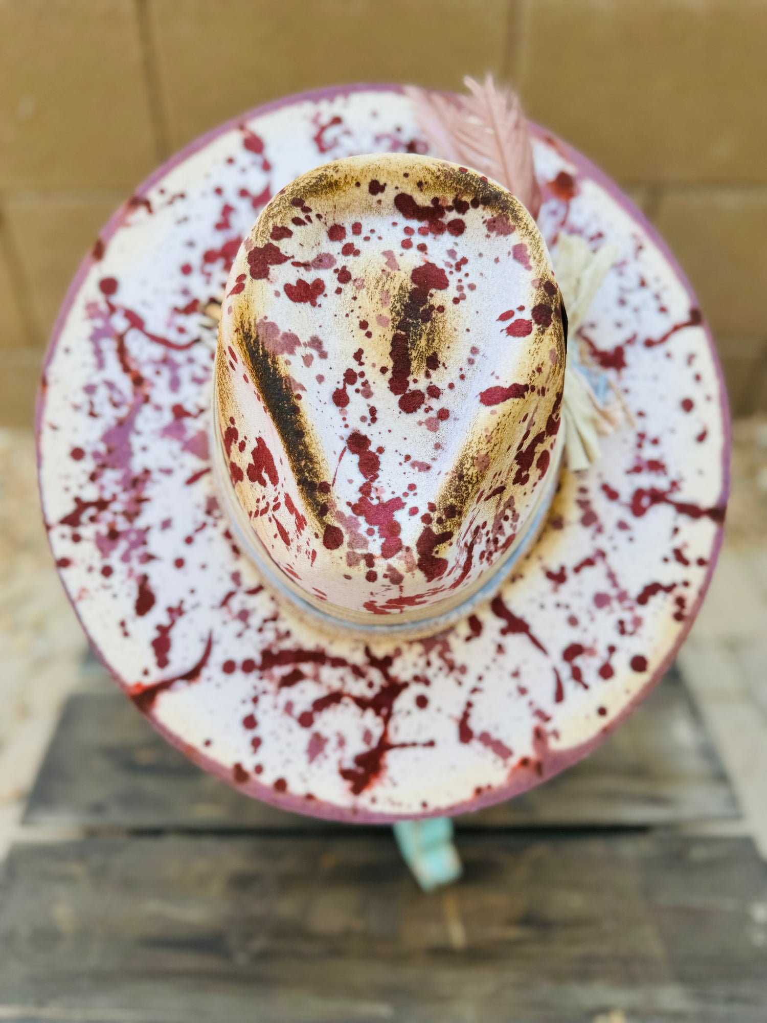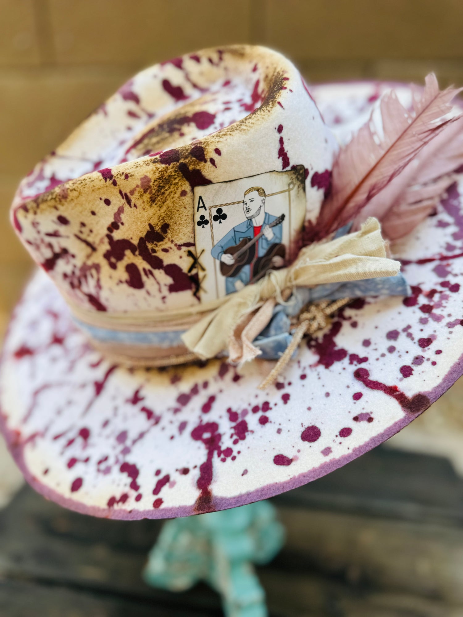 this ivory color felt hat has been hand dyed with a metallic dye and burn distressing to give it a unique one of a kind splatter look. It has a hand burned smokeshow lyric inspired by Zach Bryan with a limited edition, Zach Brian, playing card and other vintage accessories.