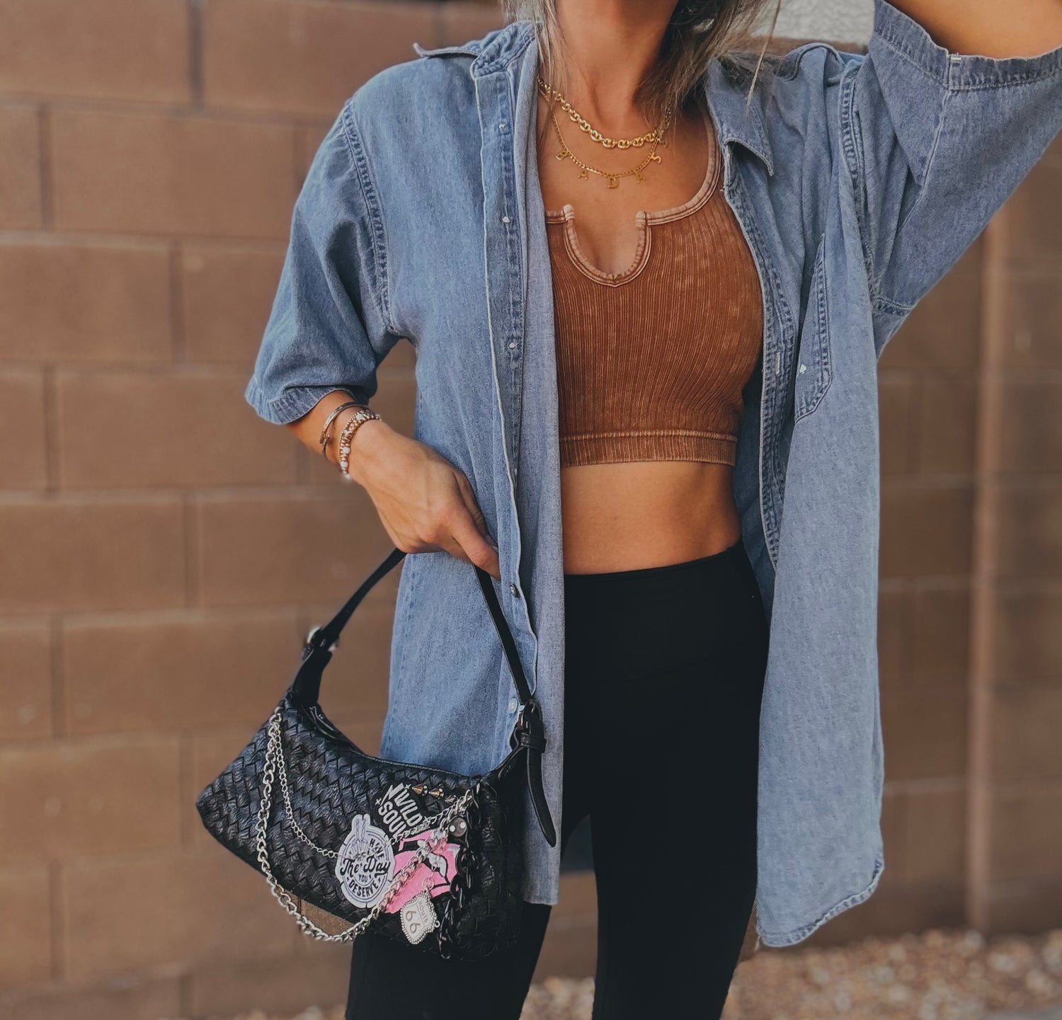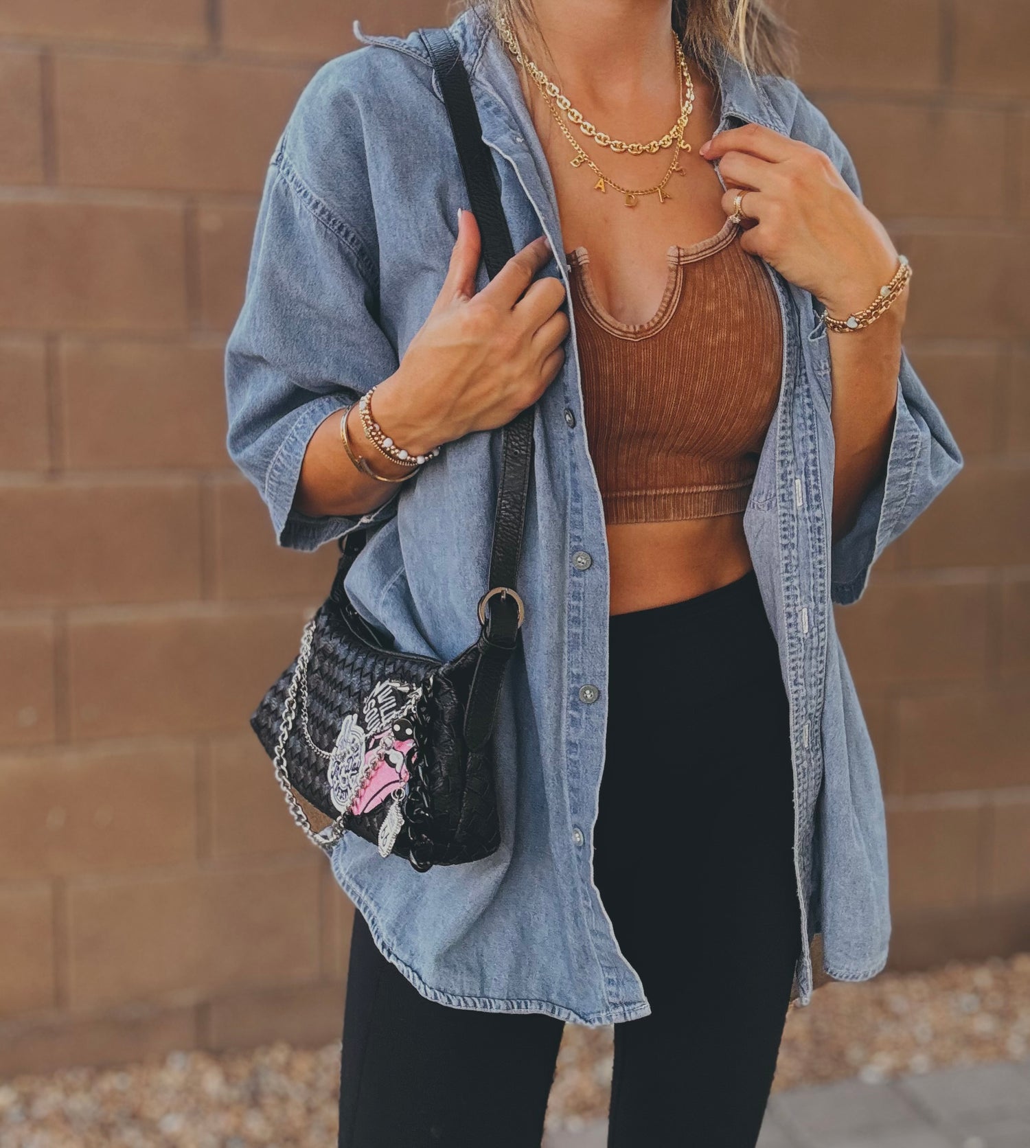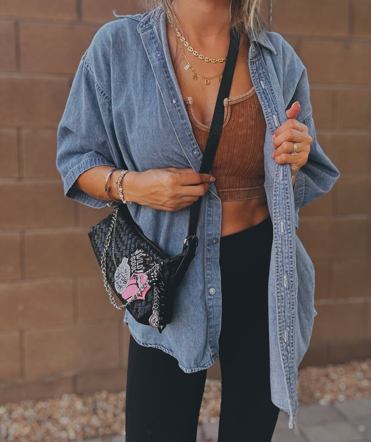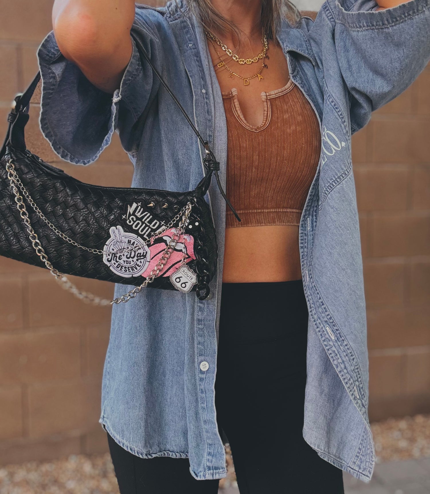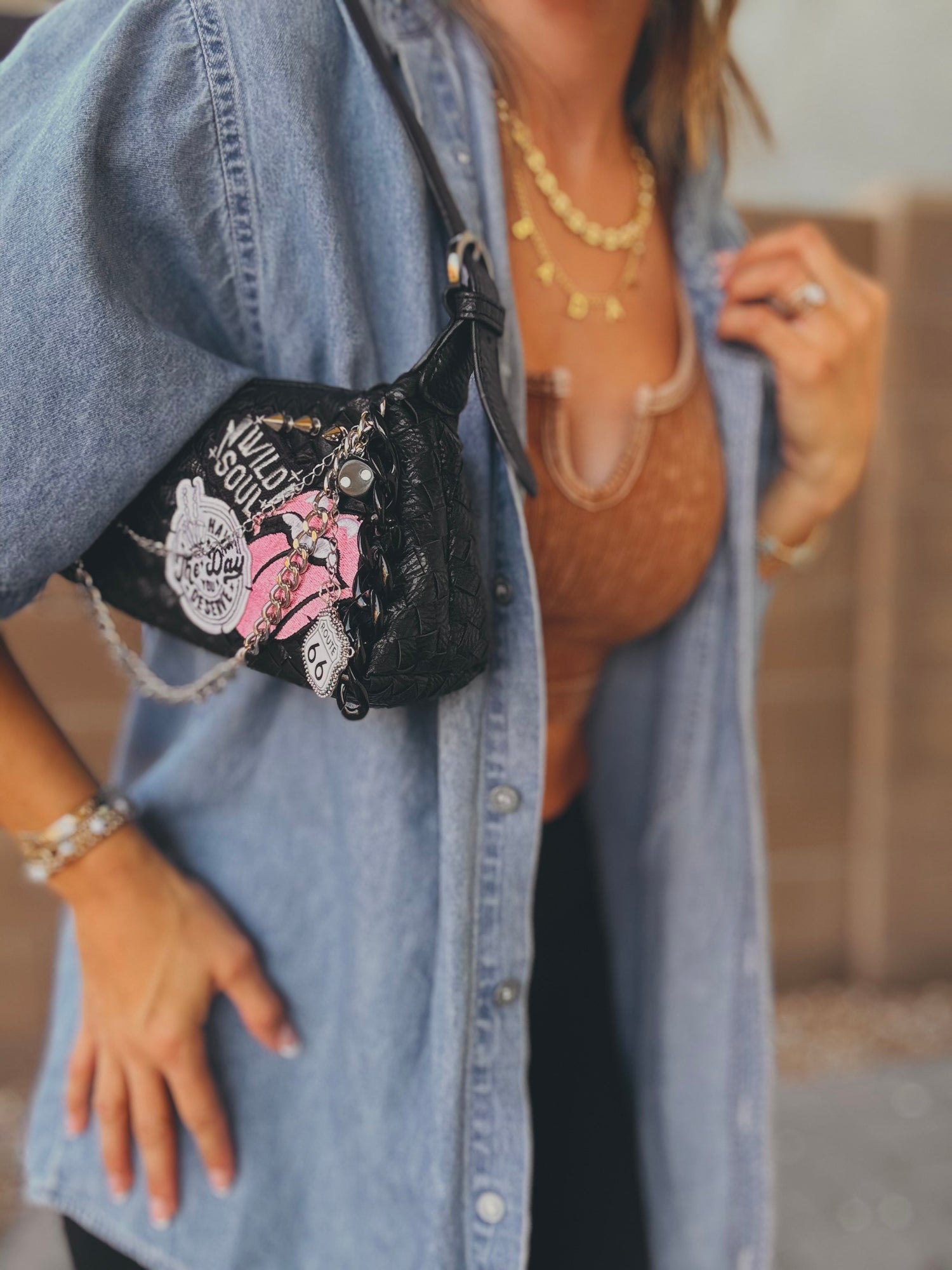 THIS IS A HANDMADE APPLICATION. ALL ITEMS ADDED TO THE BAGS ARE OF A RAW AND NATURAL MATERIAL. ALL CHARMS AND ACCESSORIES ARE FOR LOOK PURPOSES NOT USE AND SHOULD BE USED AND WOEN WITH EXTRA CARE! PLEASE SEE CARE CARDS AND FOLLOW CARE AND USE INSTRUCTIONS