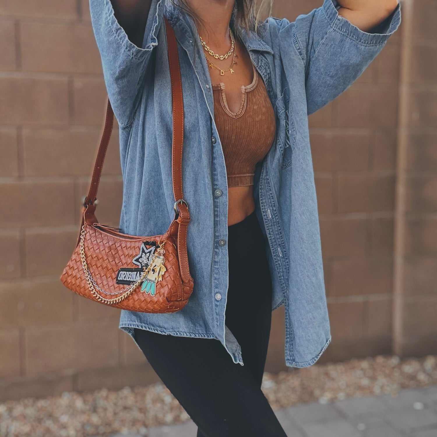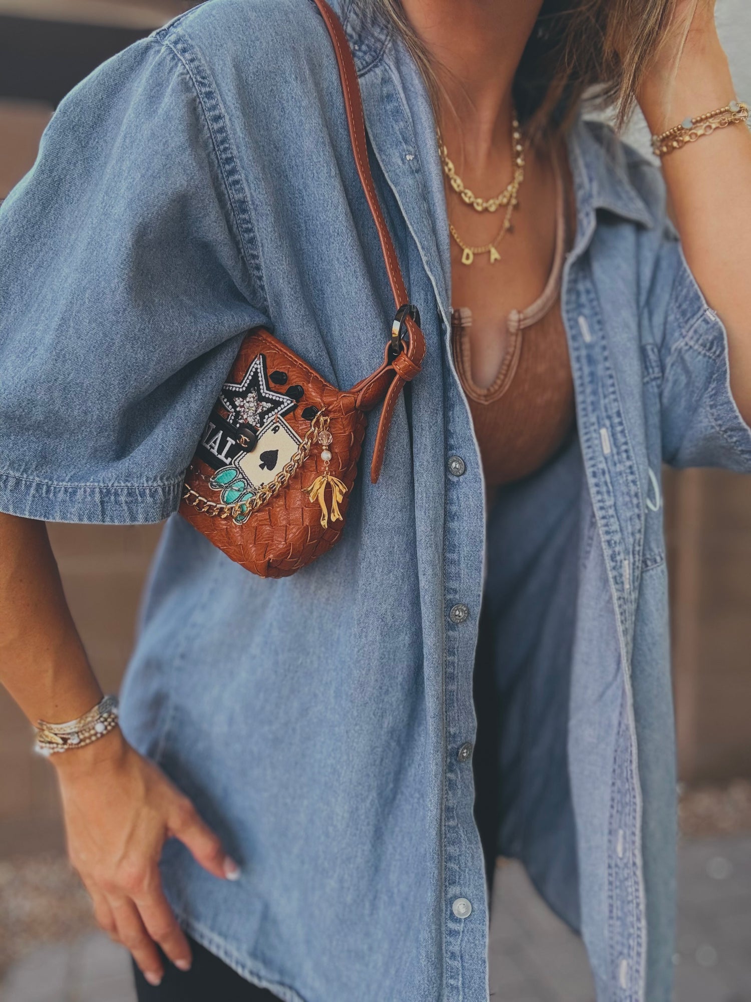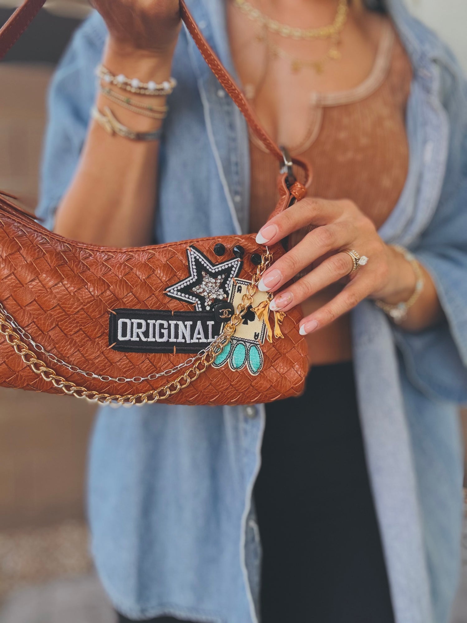 THIS IS A HANDMADE APPLICATION. ALL ITEMS ADDED TO THE BAGS ARE OF A RAW AND NATURAL MATERIAL. ALL CHARMS AND ACCESSORIES ARE FOR LOOK PURPOSES NOT USE AND SHOULD BE USED AND WOEN WITH EXTRA CARE! PLEASE SEE CARE CARDS AND FOLLOW CARE AND USE INSTRUCTIONS