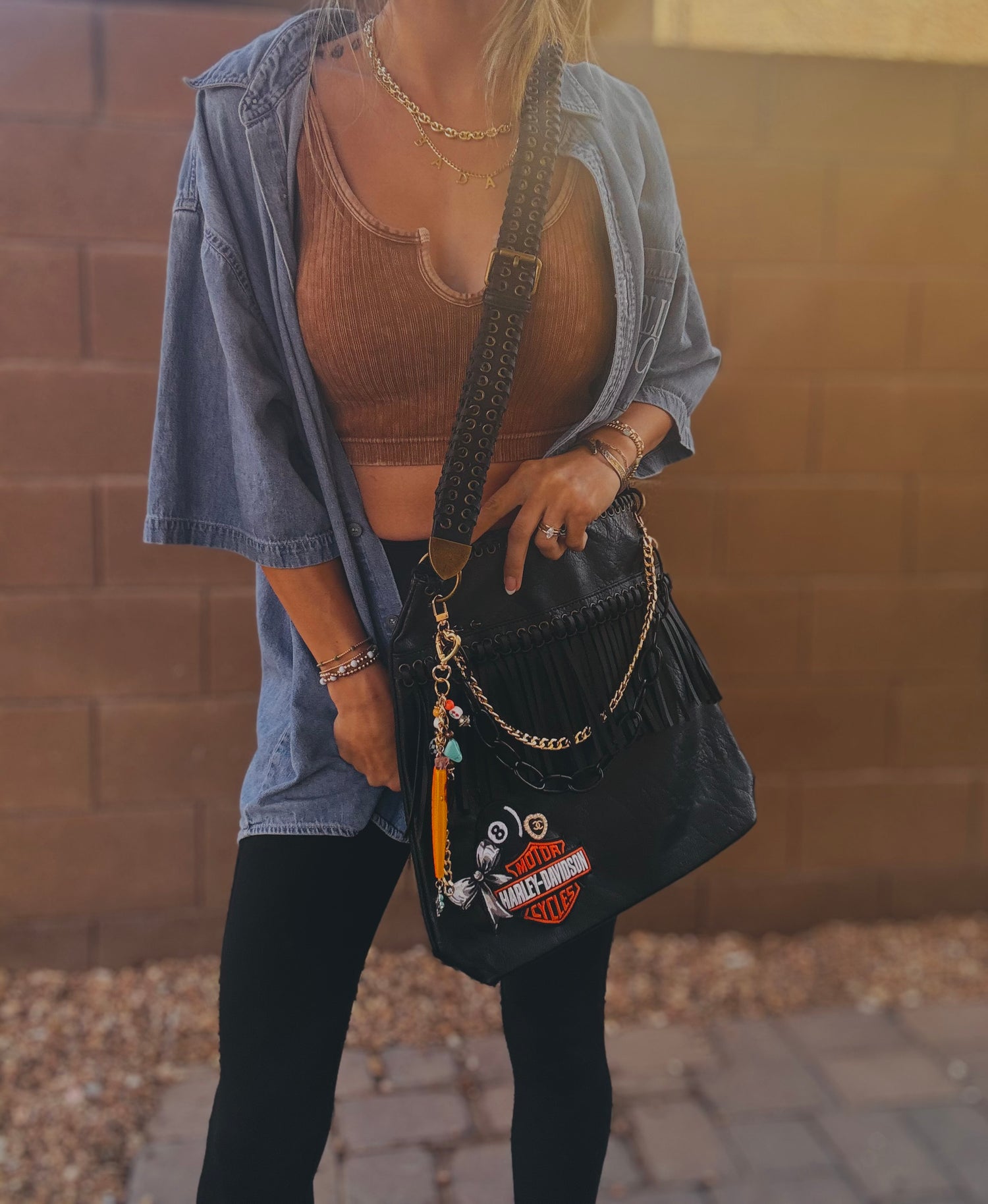 FC-bike babe+ Authentic upcycled button- handmade badass charms FRINGE +buckle CROSSBODY