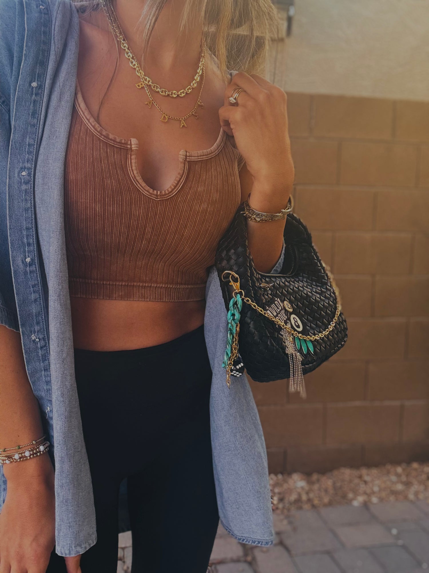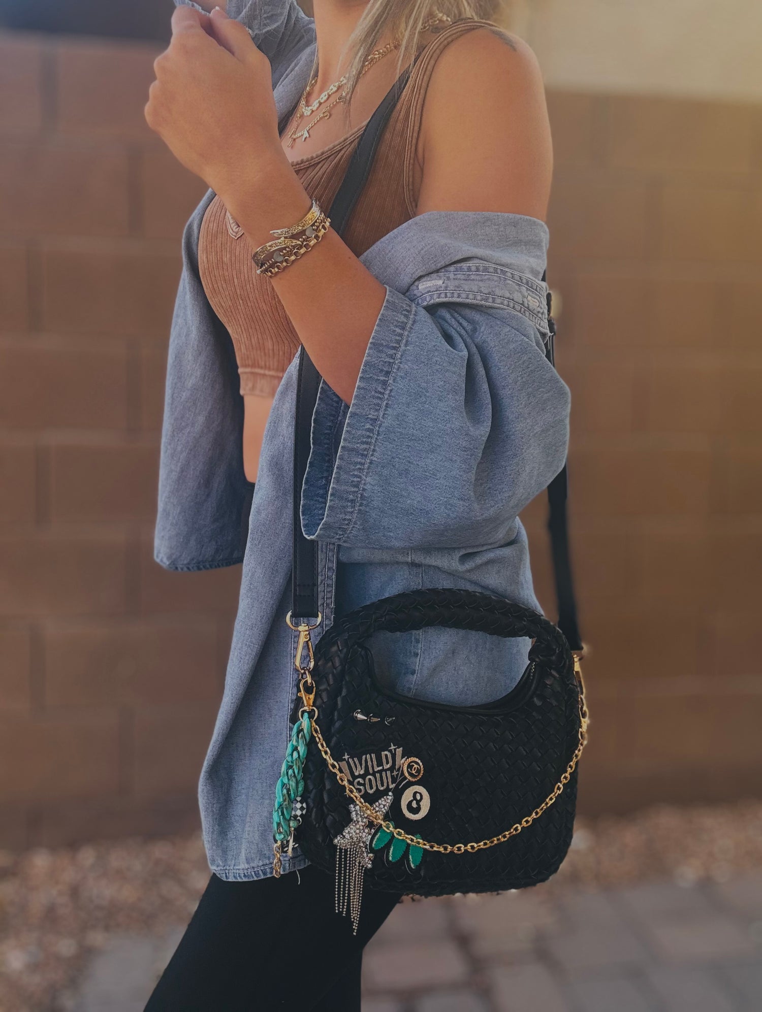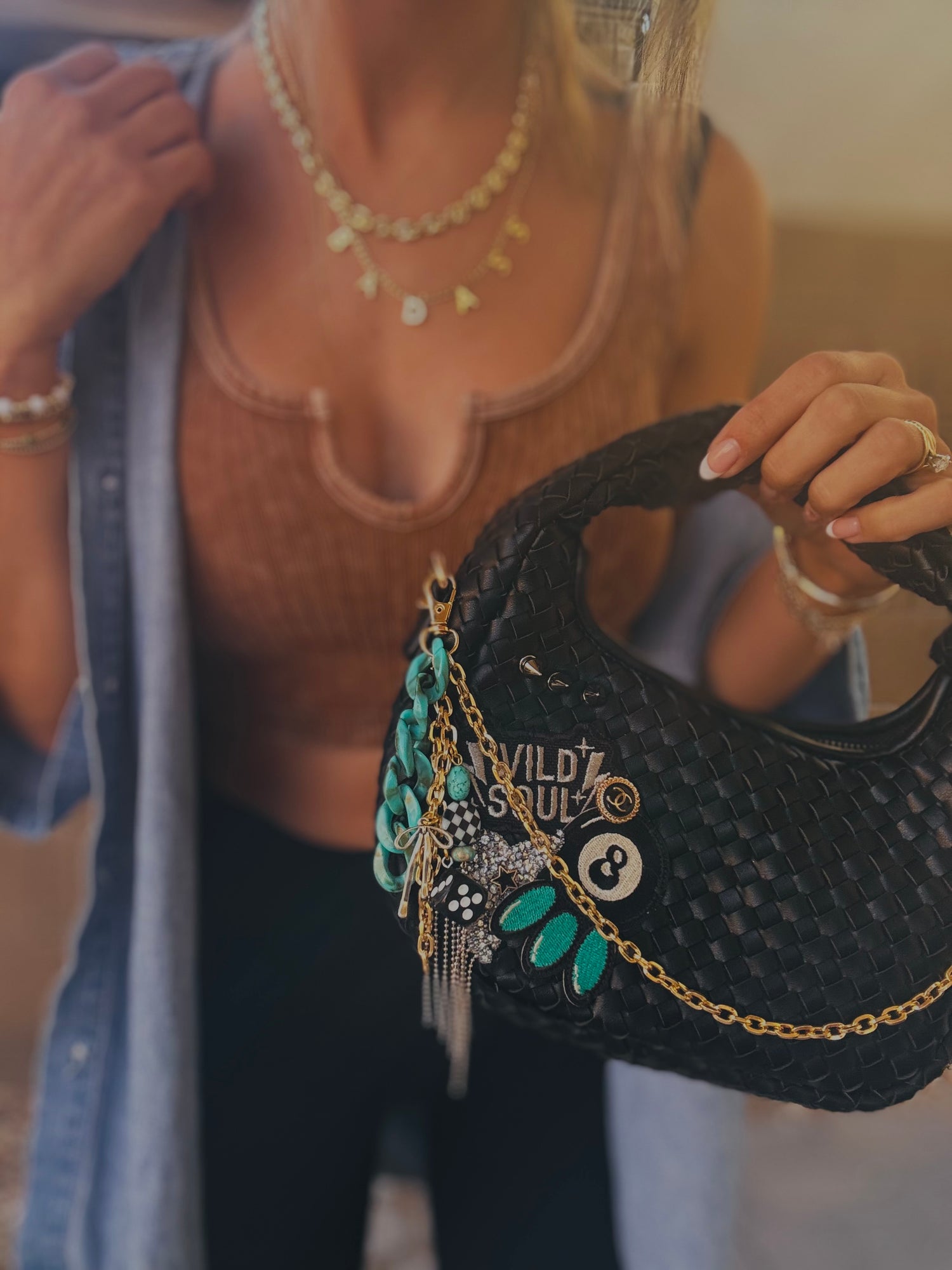 THIS IS A HANDMADE APPLICATION. ALL ITEMS ADDED TO THE BAGS ARE OF A RAW AND NATURAL MATERIAL. ALL ACCESSORIES AND CHARMS SHOULD BE WORN WITH CARE AS THEY ARE FOR DECOR PURPOSES ONLY PLEASE SEE CARE CARDS AND FOLLOW CARE AND USE INSTRUCTIONS