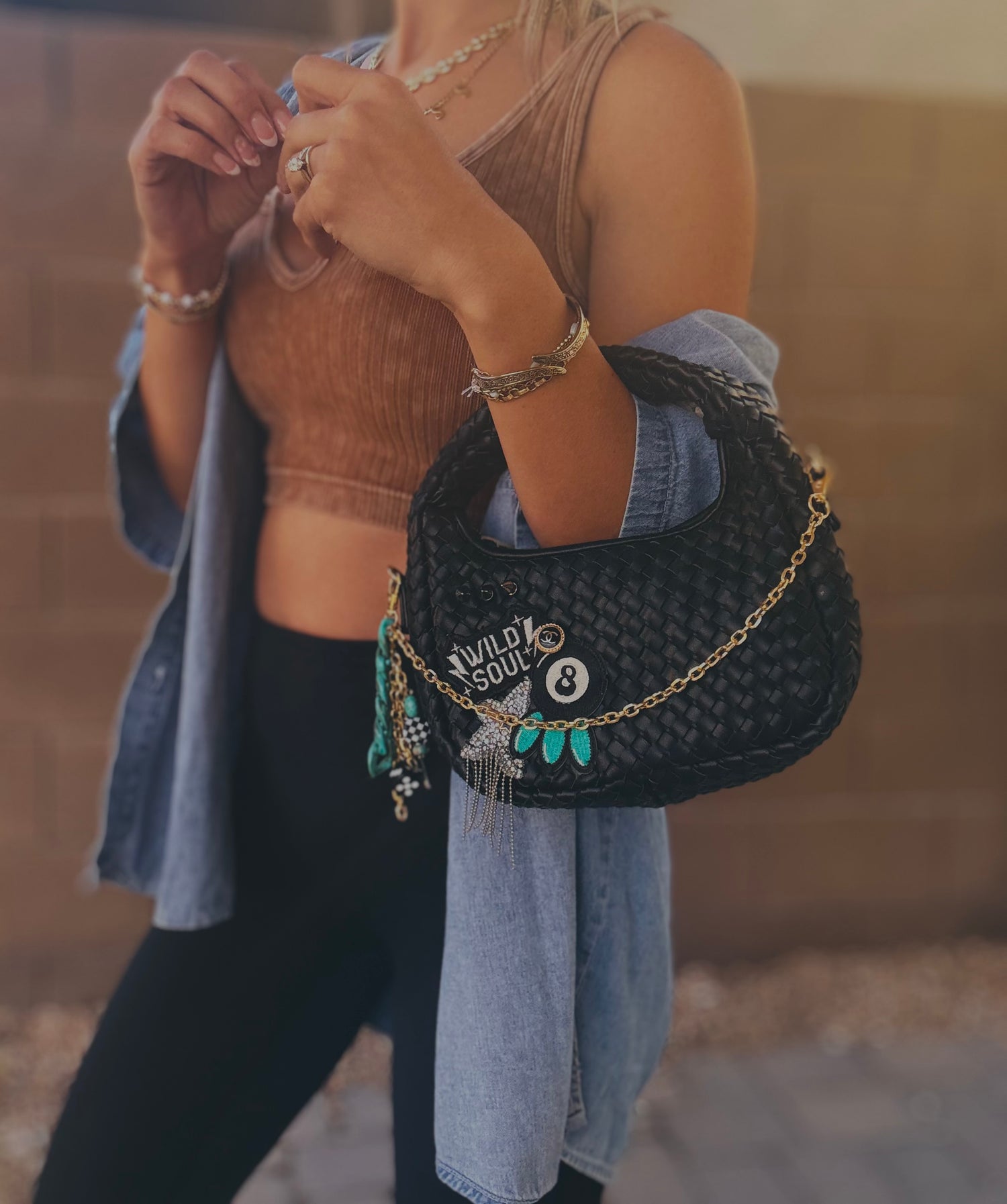 This is The Scottsdale Purse. Made with High quality Vegan Woven Leather. All exterior designs, applications and accessories have been Handmade and created by CM CO.