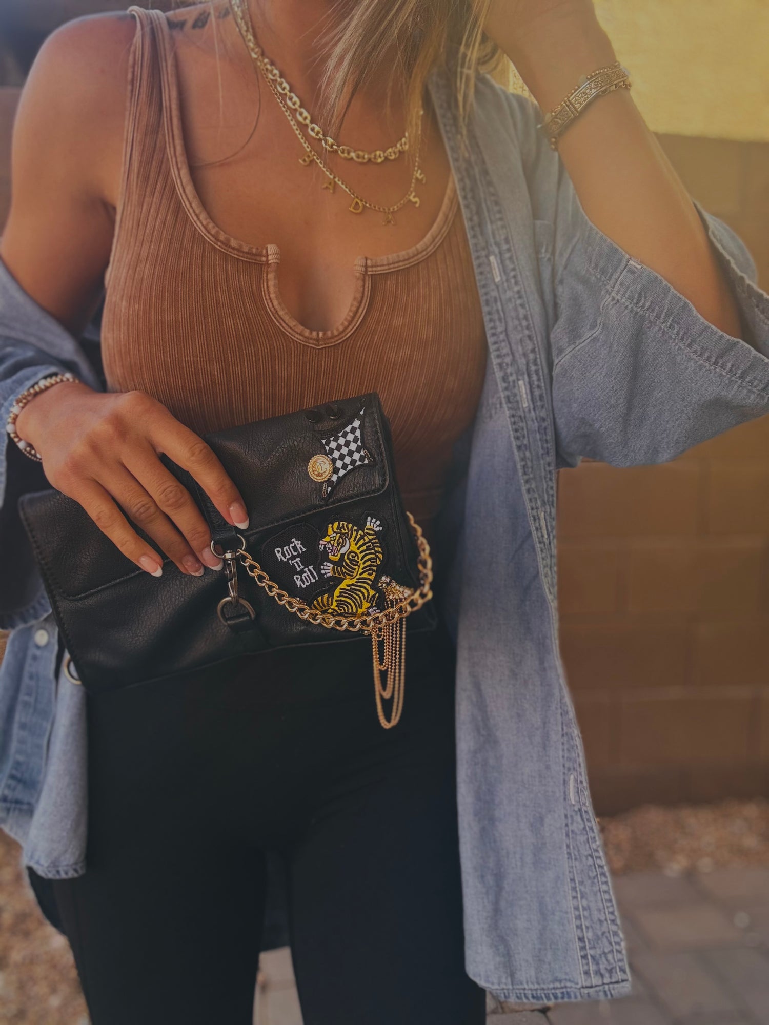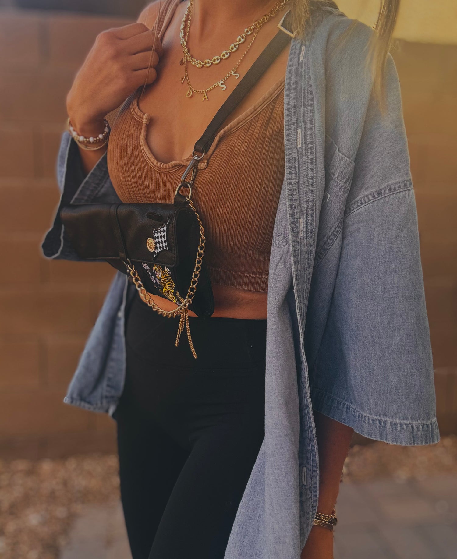 THIS IS A HANDMADE APPLICATION. ALL ITEMS ADDED TO THE BAGS ARE OF A RAW AND NATURAL MATERIAL. ALL CHARMS AND ACCESSORIES ARE FOR LOOK PURPOSES NOT USE AND SHOULD BE USED AND WOEN WITH EXTRA CARE! PLEASE SEE CARE CARDS AND FOLLOW CARE AND USE INSTRUCTIONS