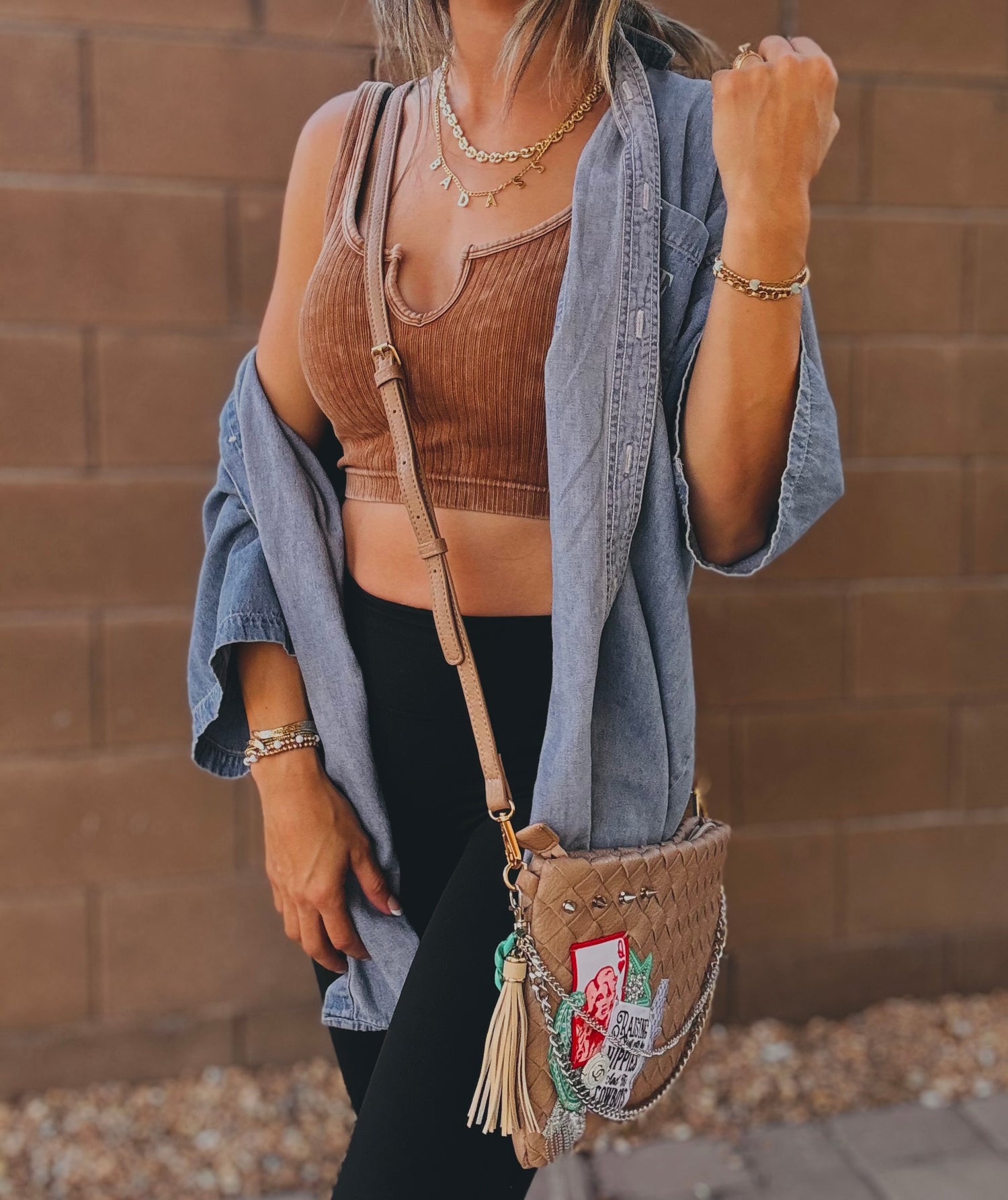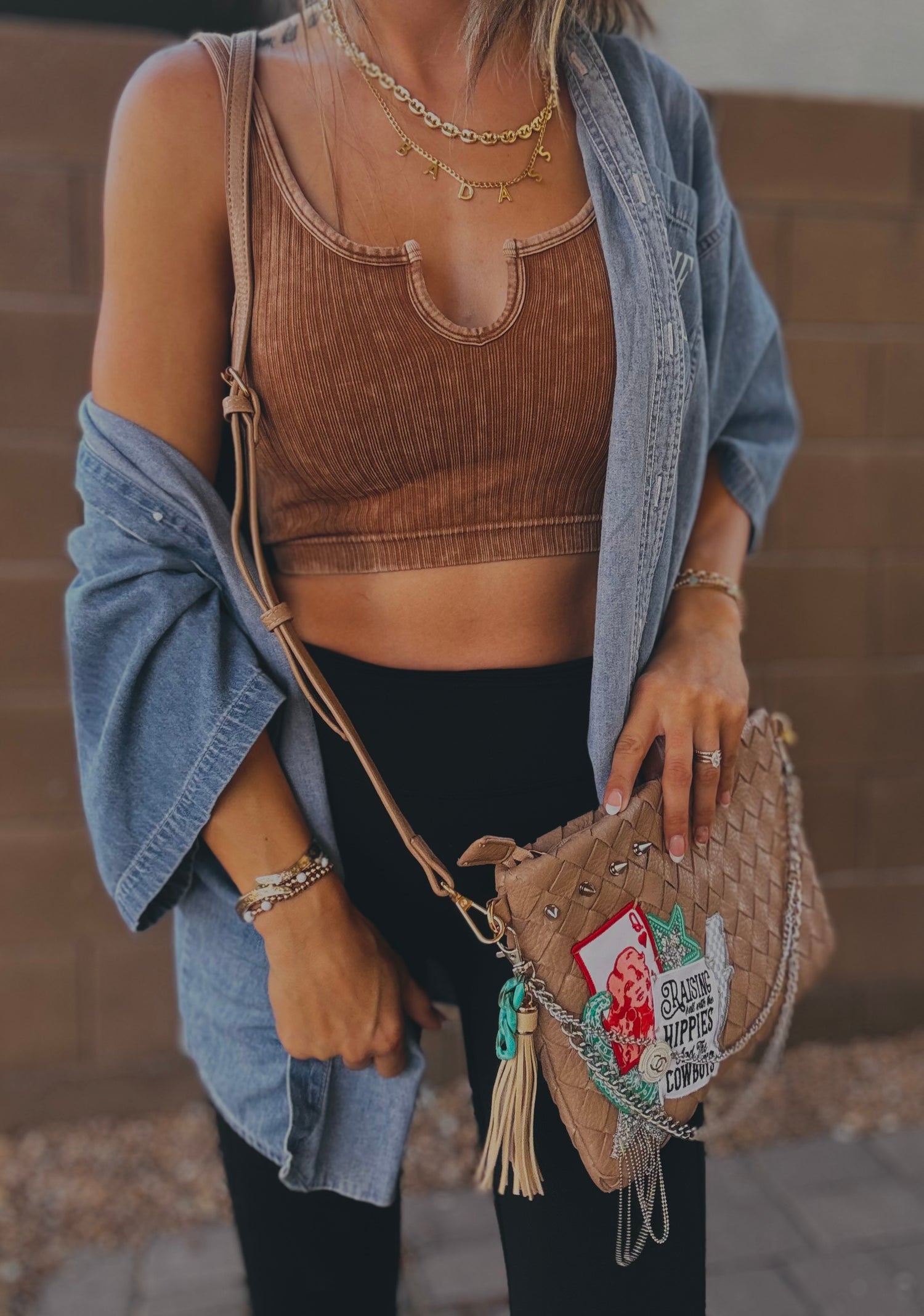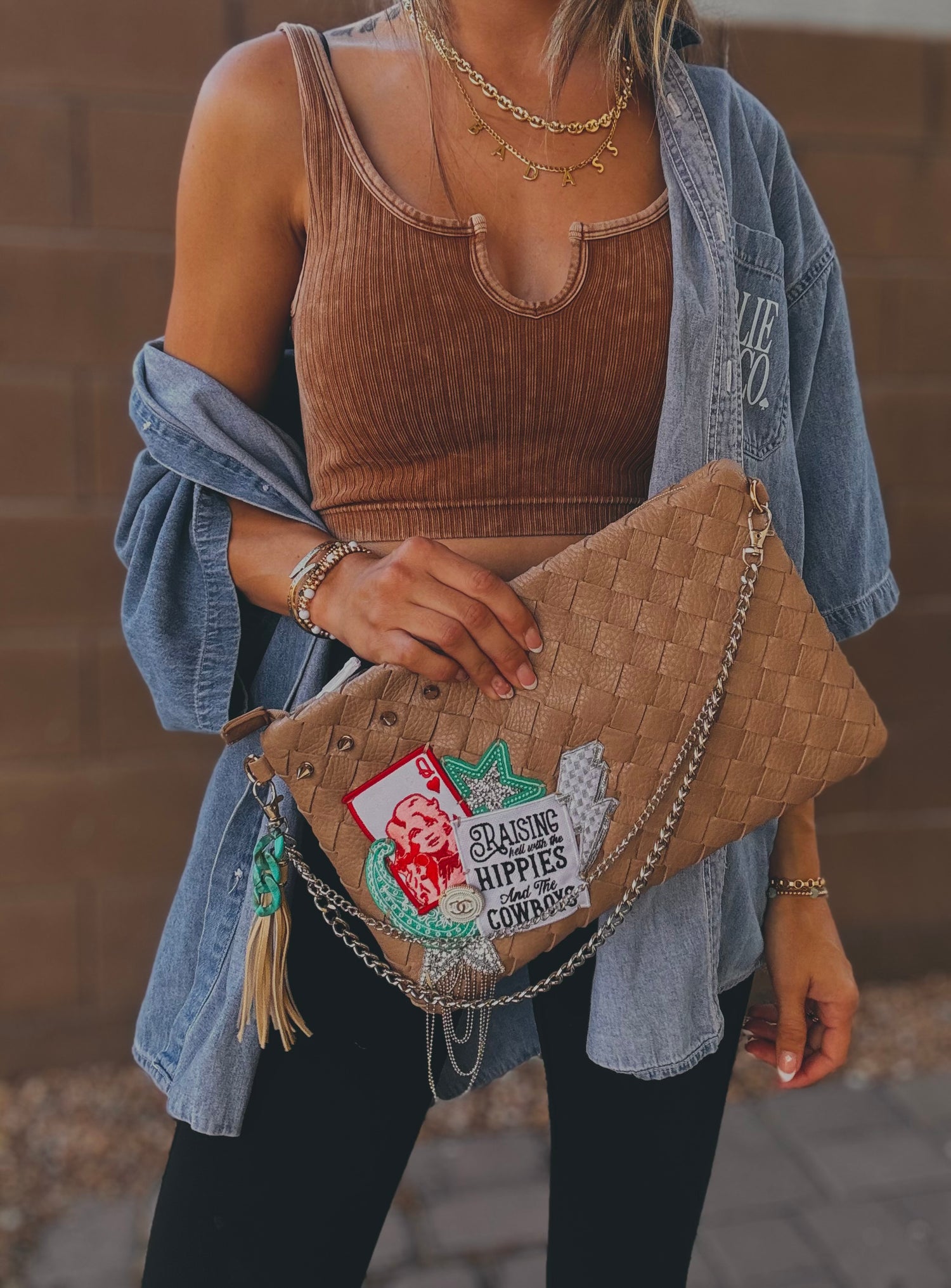 THIS IS A HANDMADE APPLICATION. ALL ITEMS ADDED TO THE BAGS ARE OF A RAW AND NATURAL MATERIAL. ALL CHARMS AND ACCESSORIES ARE FOR LOOK PURPOSES NOT USE AND SHOULD BE USED AND WOEN WITH EXTRA CARE! PLEASE SEE CARE CARDS AND FOLLOW CARE AND USE INSTRUCTIONS