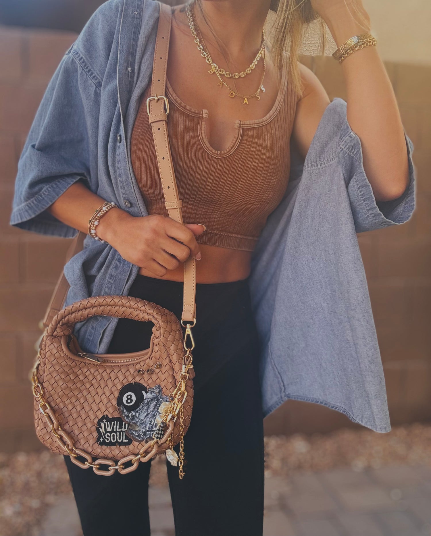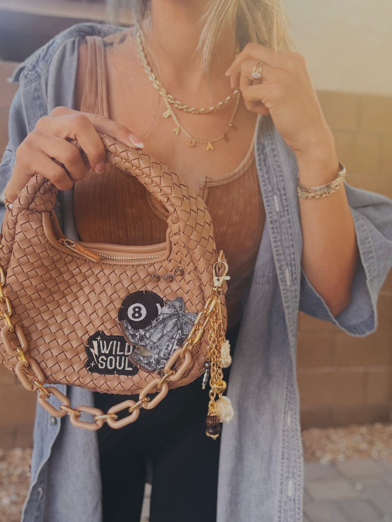 This is The Scottsdale Purse. Made with High quality Vegan Woven Leather. All exterior designs, applications and accessories have been Handmade and created by CM CO.