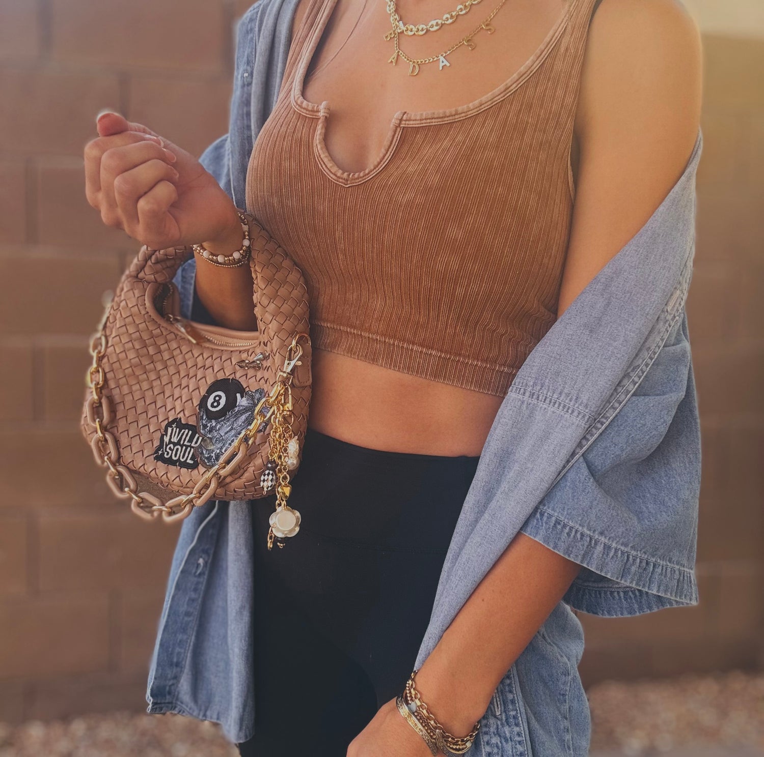 THIS IS A HANDMADE APPLICATION. ALL ITEMS ADDED TO THE BAGS ARE OF A RAW AND NATURAL MATERIAL. ALL ACCESSORIES AND CHARMS SHOULD BE WORN WITH CARE AS THEY ARE FOR DECOR PURPOSES ONLY PLEASE SEE CARE CARDS AND FOLLOW CARE AND USE INSTRUCTIONS