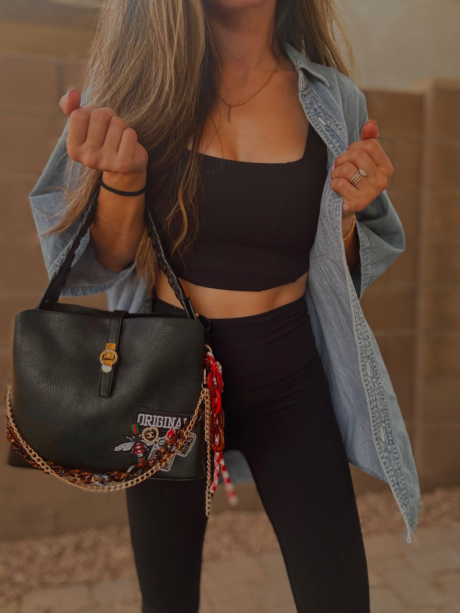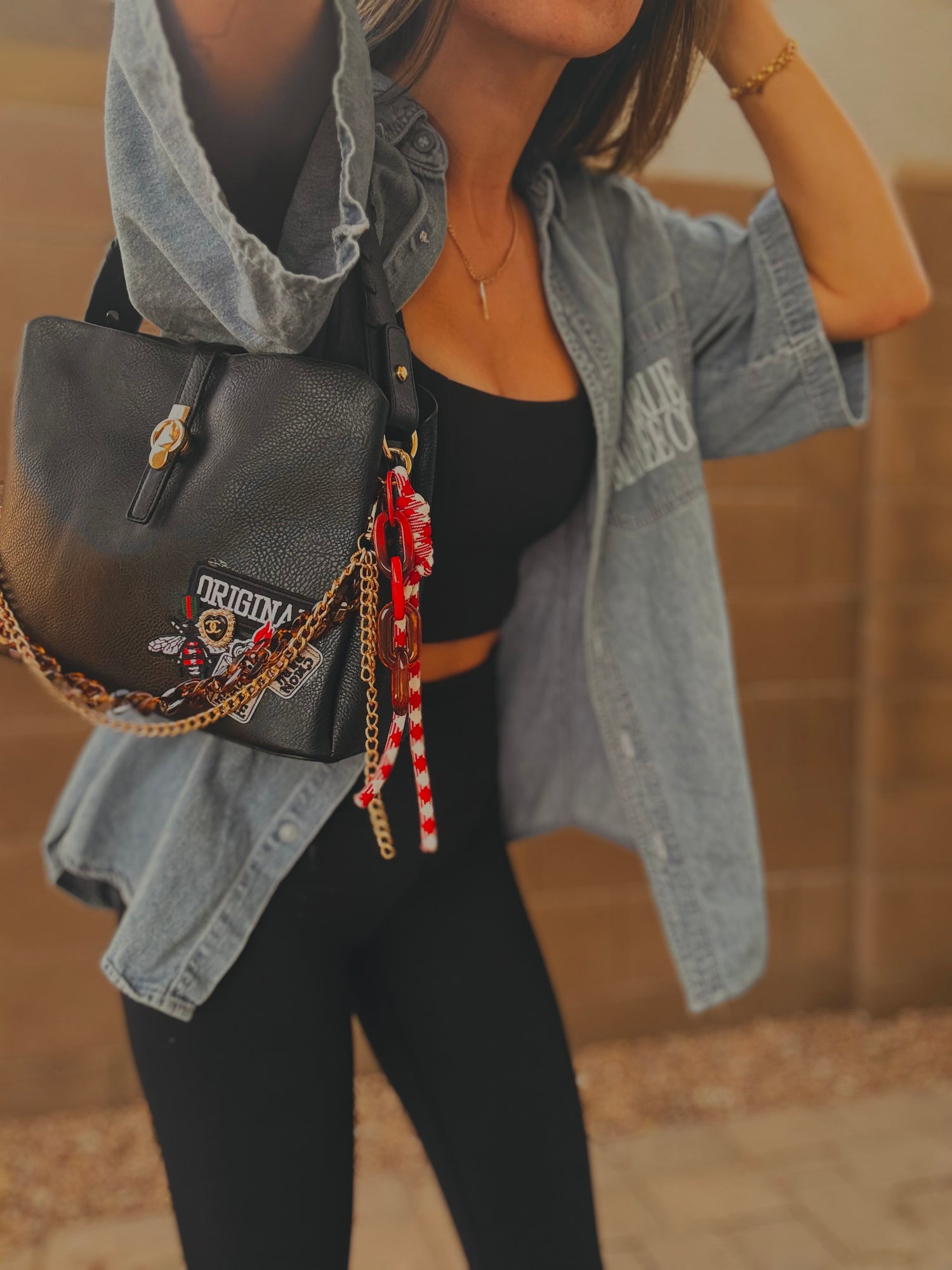 THIS IS A HANDMADE APPLICATION. ALL ITEMS ADDED TO THE BAGS ARE OF A RAW AND NATURAL MATERIAL. ALL CHARMS AND ACCESSORIES ARE FOR LOOK PURPOSES NOT USE AND SHOULD BE USED AND WOEN WITH EXTRA CARE! PLEASE SEE CARE CARDS AND FOLLOW CARE AND USE INSTRUCTIONS
