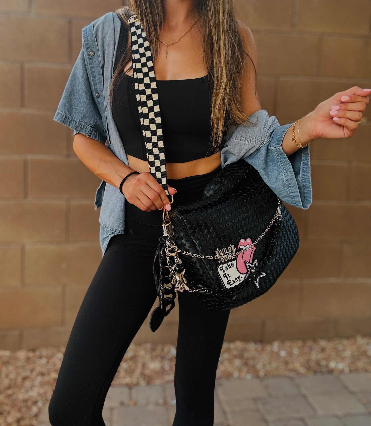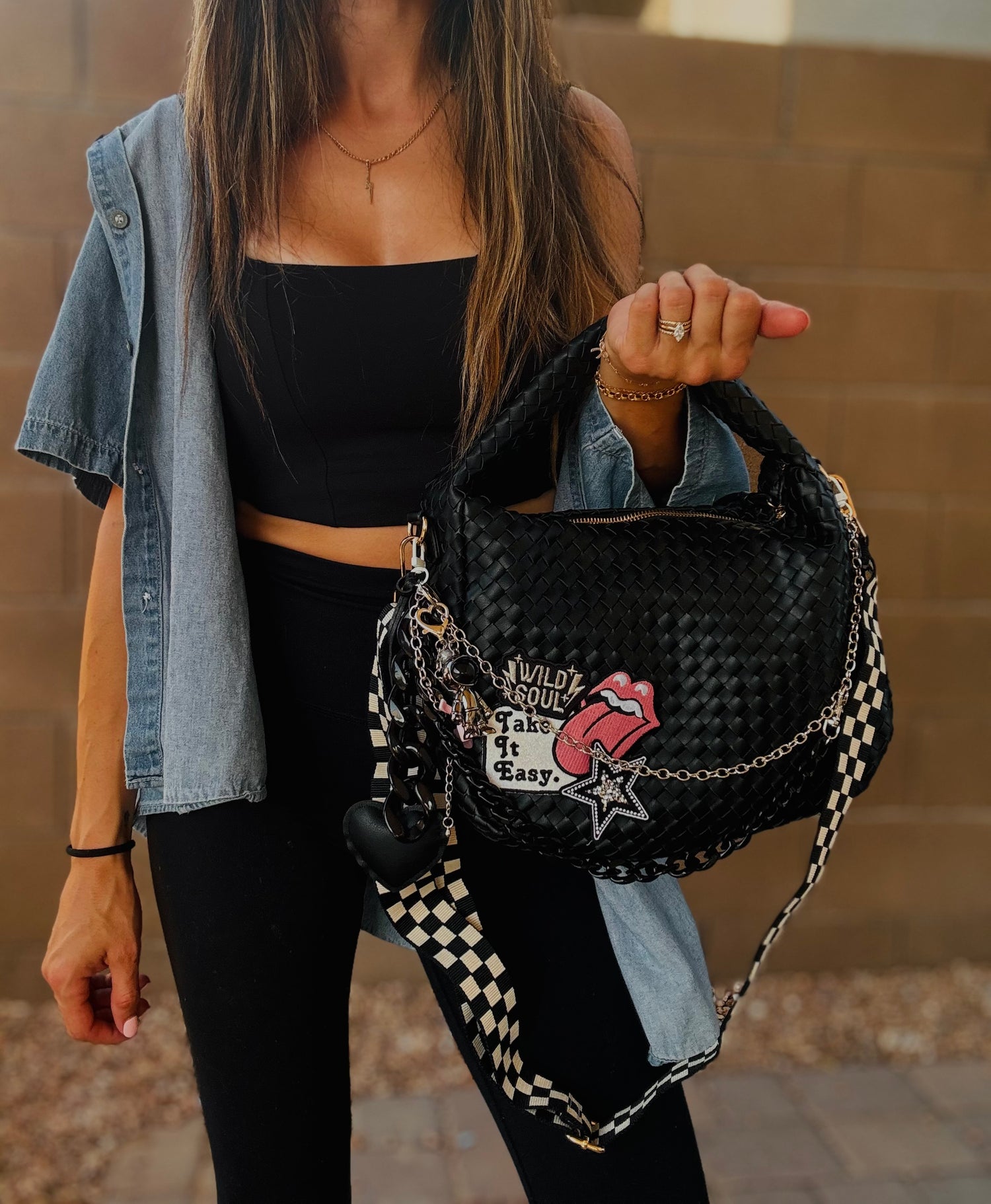 This is The CHANDLER HOBO CROSSBODY Purse. Made with High quality Vegan Woven Leather. All exterior designs, applications and accessories have been Handmade and created by CM CO.