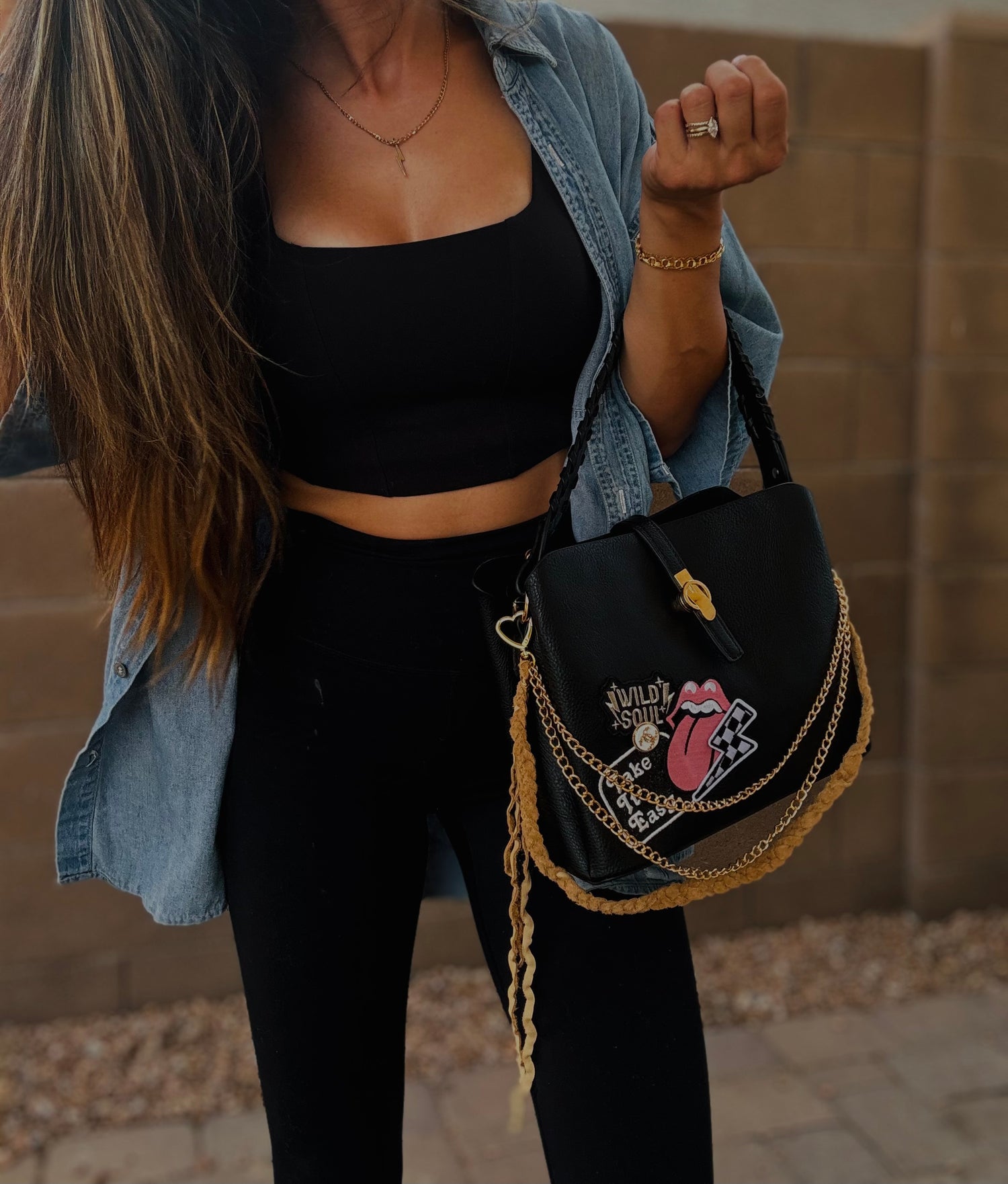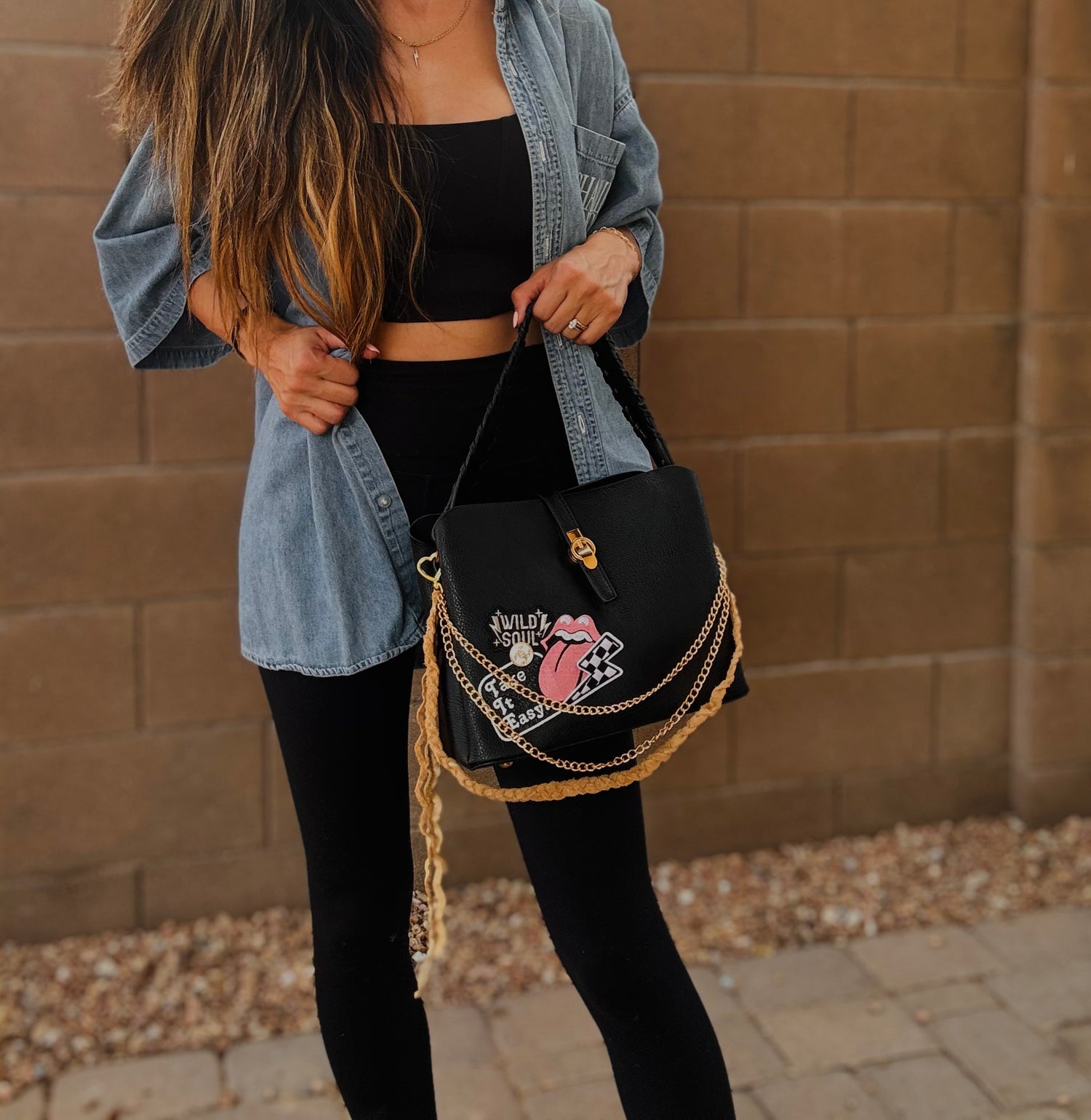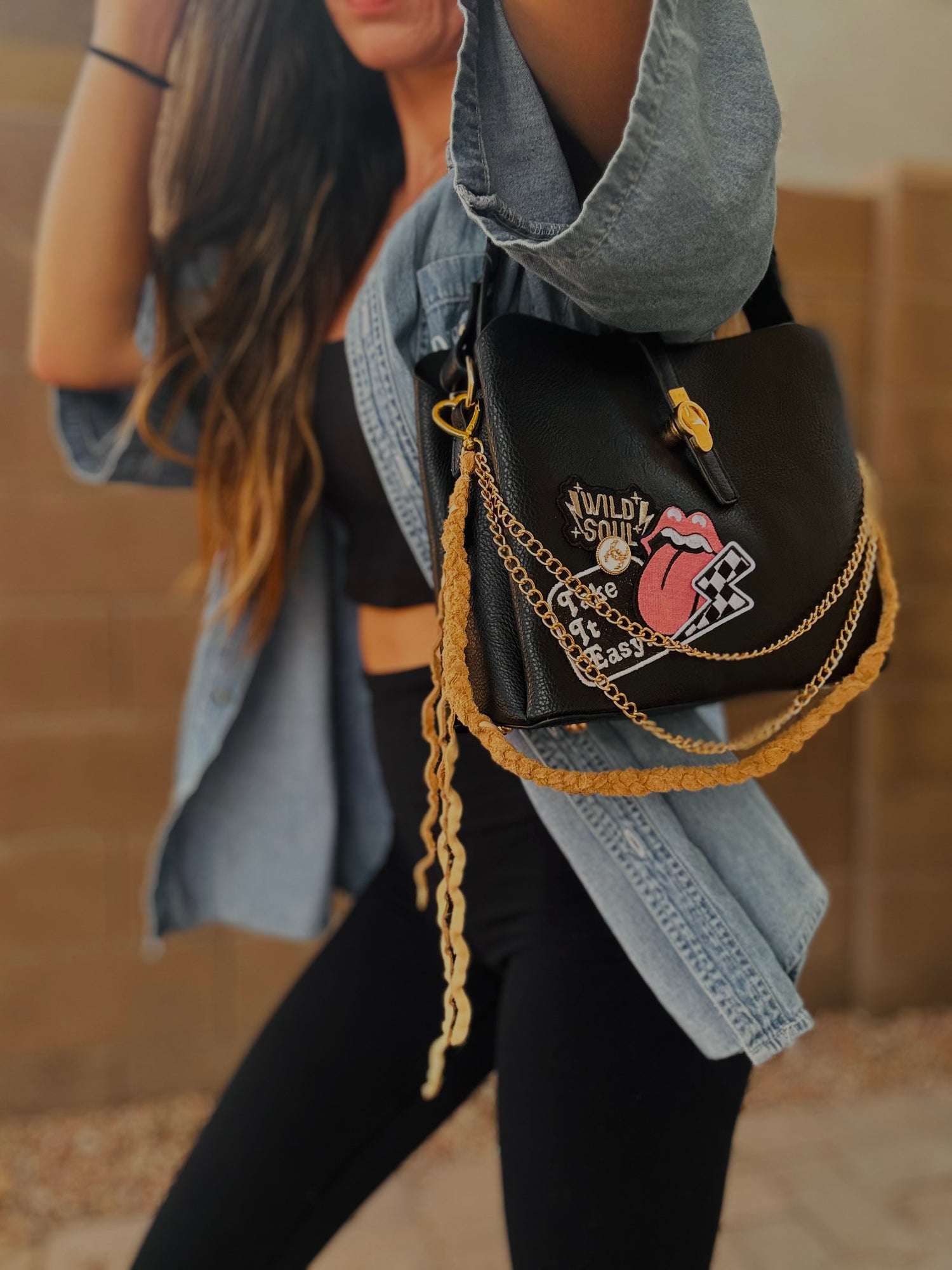 THIS IS A HANDMADE APPLICATION. ALL ITEMS ADDED TO THE BAGS ARE OF A RAW AND NATURAL MATERIAL. ALL CHARMS AND ACCESSORIES ARE FOR LOOK PURPOSES NOT USE AND SHOULD BE USED AND WOEN WITH EXTRA CARE! PLEASE SEE CARE CARDS AND FOLLOW CARE AND USE INSTRUCTIONS