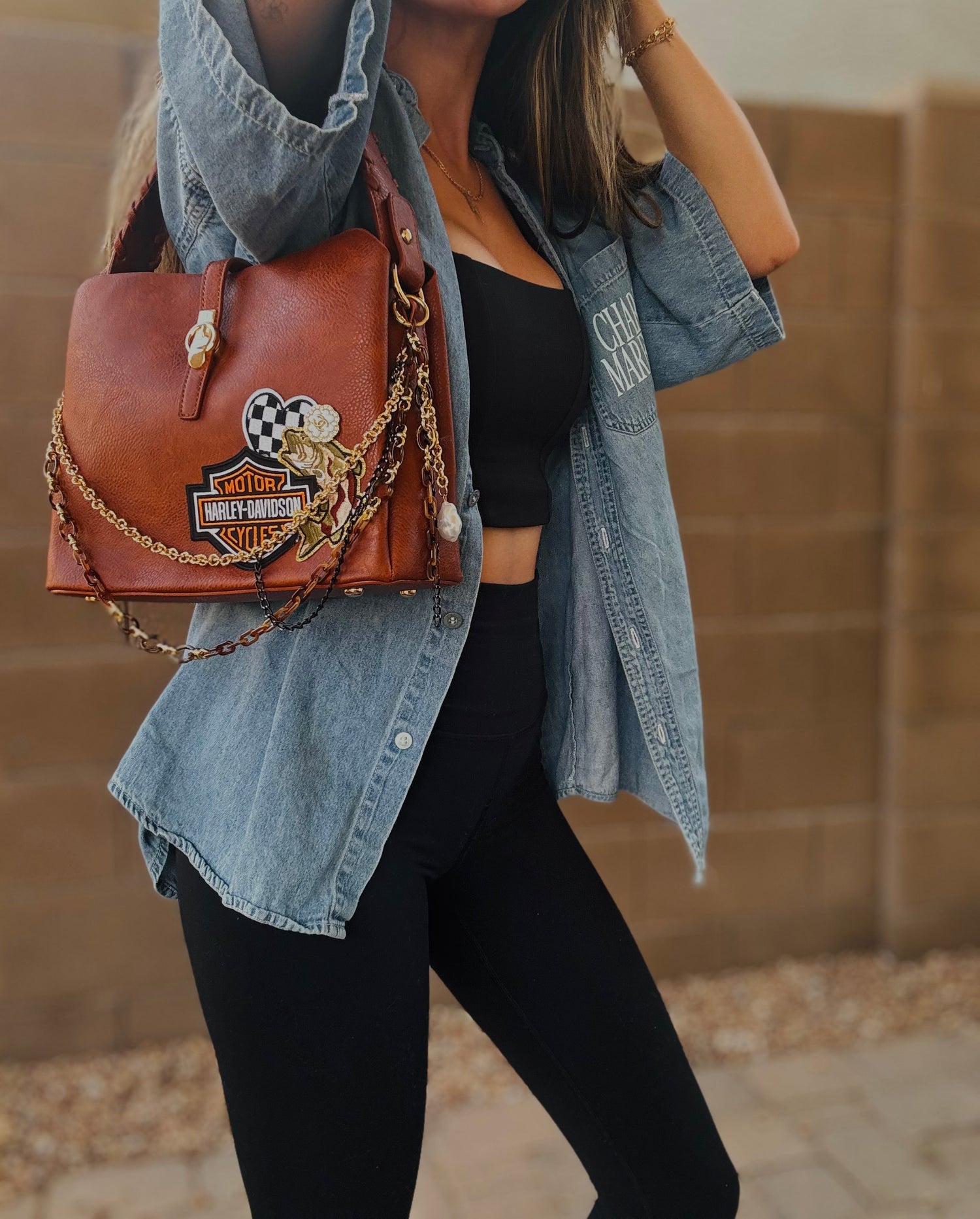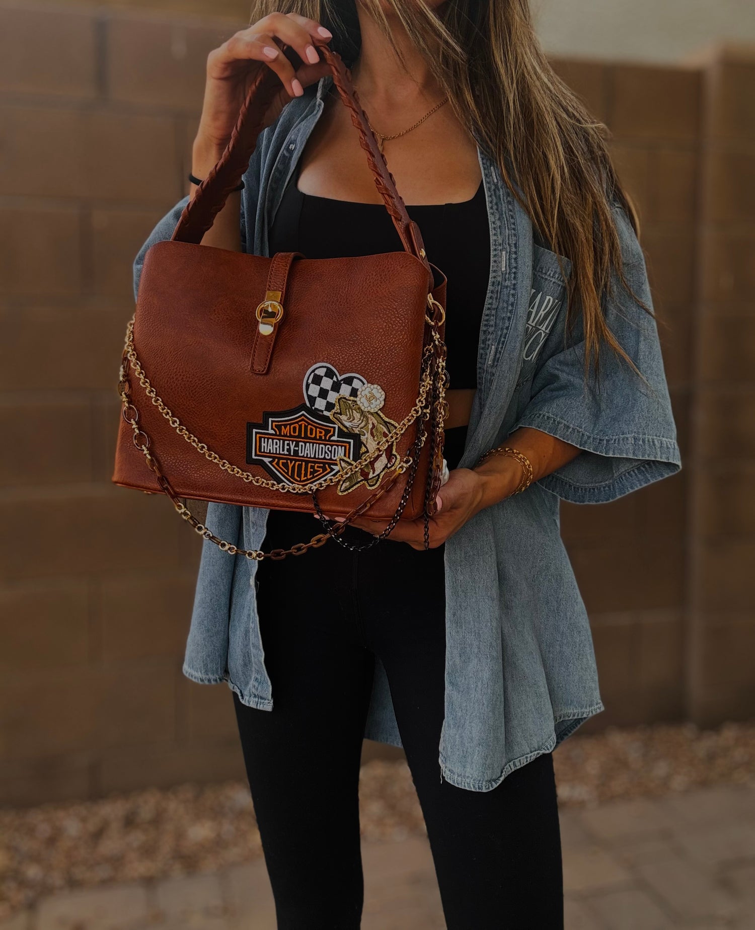 THIS IS A HANDMADE APPLICATION. ALL ITEMS ADDED TO THE BAGS ARE OF A RAW AND NATURAL MATERIAL. ALL CHARMS AND ACCESSORIES ARE FOR LOOK PURPOSES NOT USE AND SHOULD BE USED AND WOEN WITH EXTRA CARE! PLEASE SEE CARE CARDS AND FOLLOW CARE AND USE INSTRUCTIONS