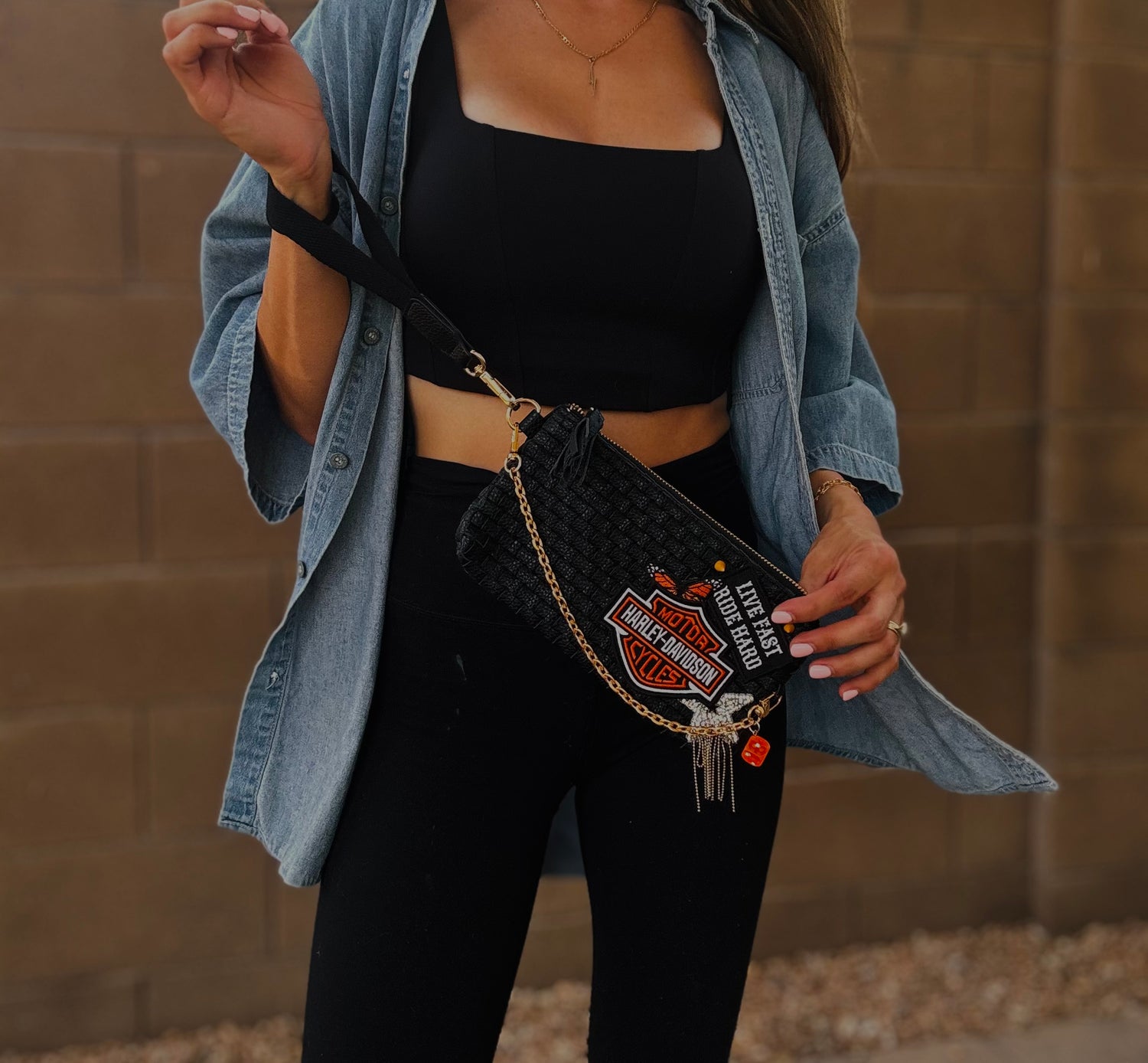 THIS IS A HANDMADE APPLICATION. ALL ITEMS ADDED TO THE BAGS ARE OF A RAW AND NATURAL MATERIAL. ALL CHARMS AND ACCESSORIES ARE FOR LOOK PURPOSES NOT USE AND SHOULD BE USED AND WOEN WITH EXTRA CARE! PLEASE SEE CARE CARDS AND FOLLOW CARE AND USE INSTRUCTIONS