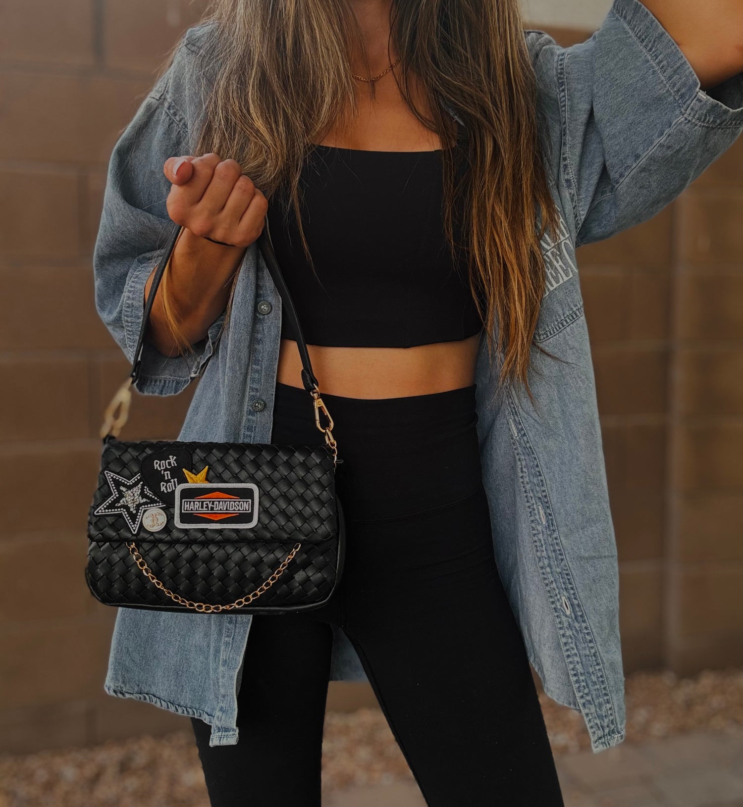 This is The Scottsdale Purse. Made with High quality Vegan Woven Leather. All exterior designs, applications and accessories have been Handmade and created by CM CO.