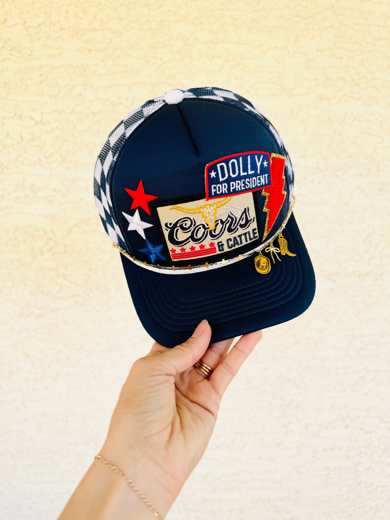 Dolly pres & beer cattle premium checkered trucker