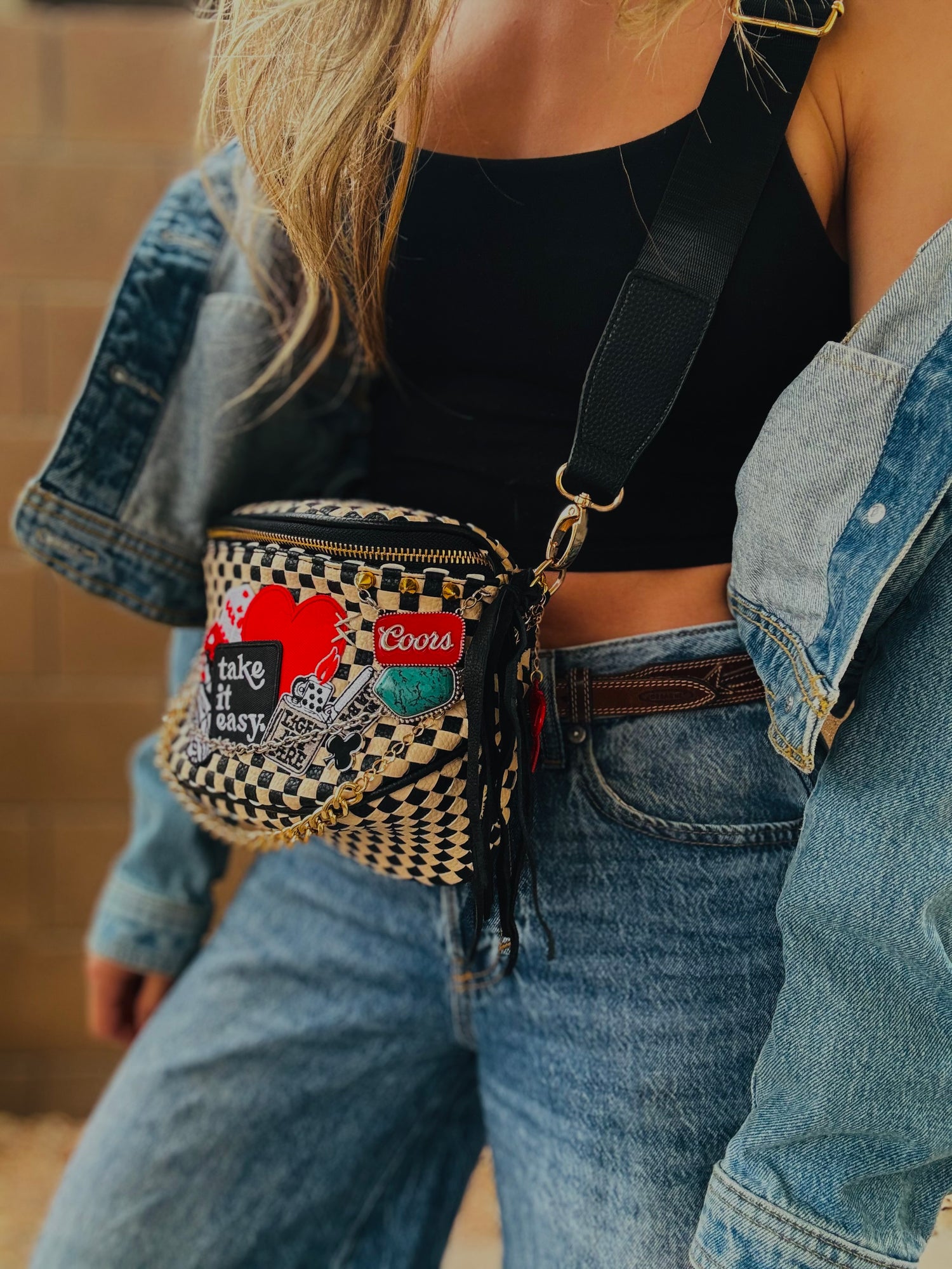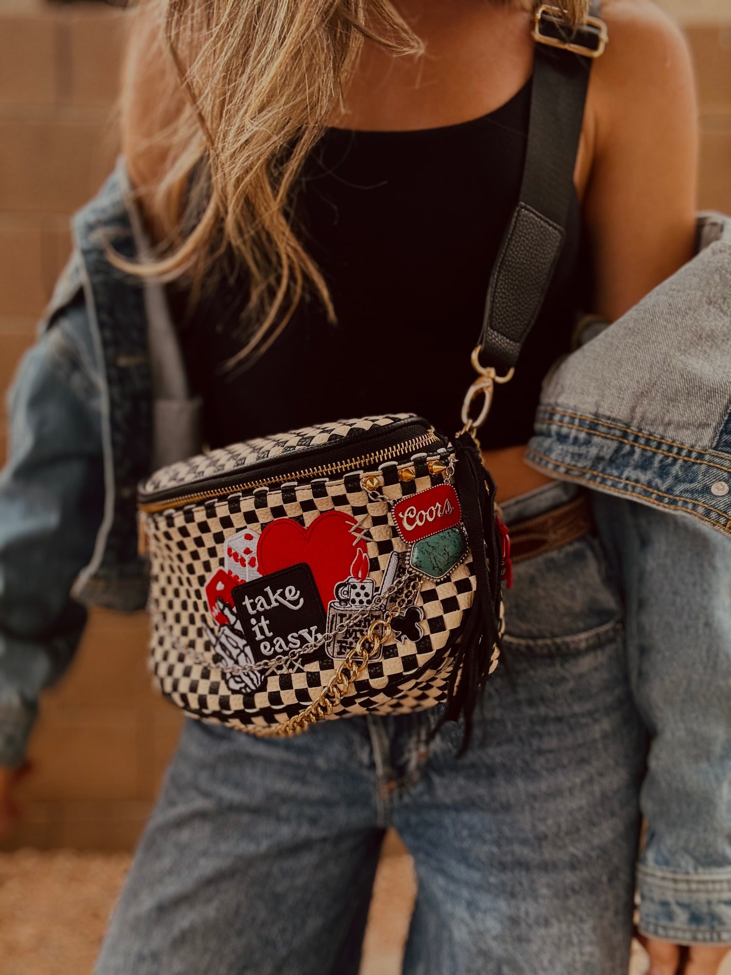 This is The PHOENIX Crossbody Purse. Made with Hugh quality Vegan Woven Leather. All exterior designs, applications and accessories have been Handmade and created by CM CO.