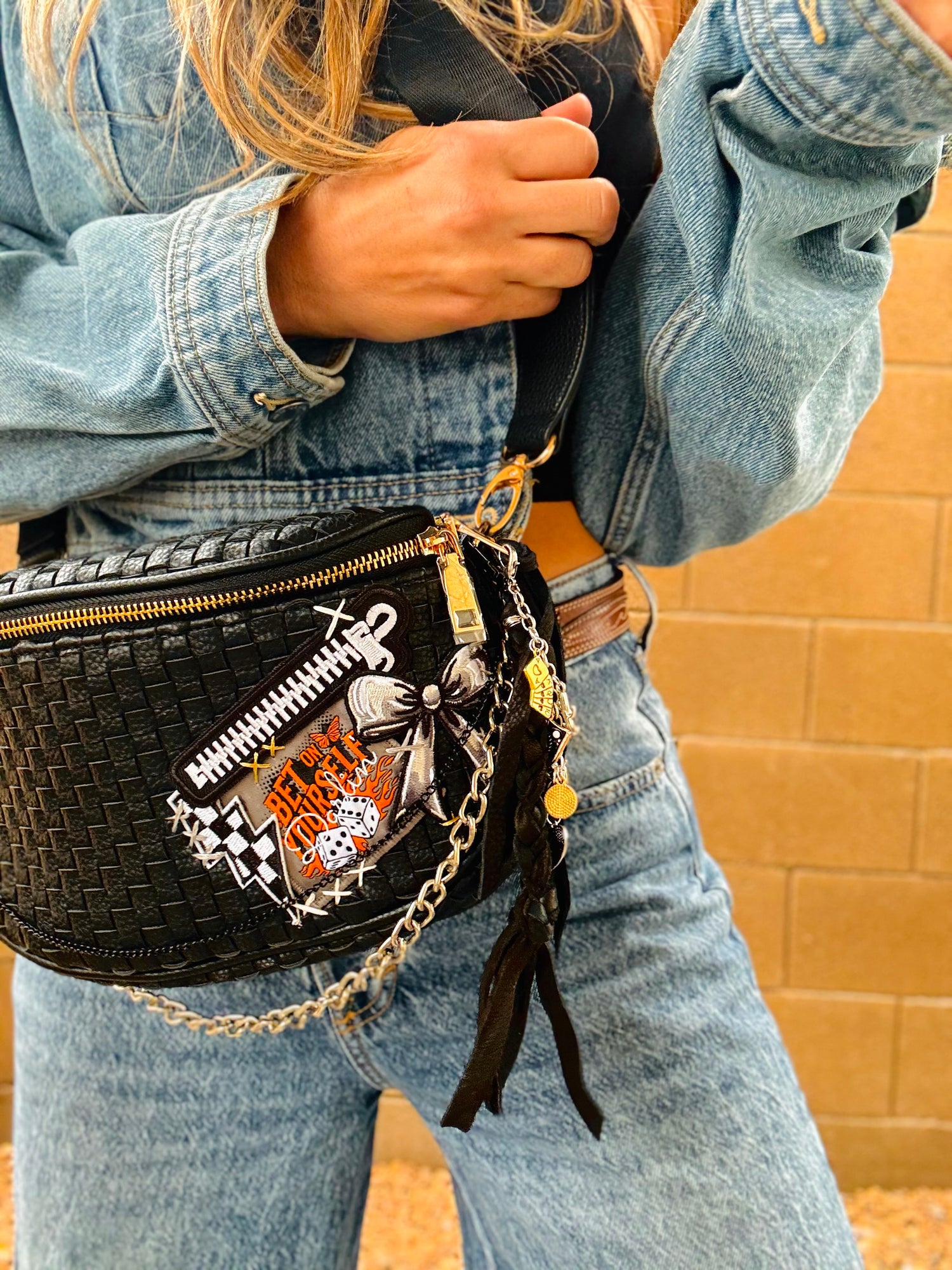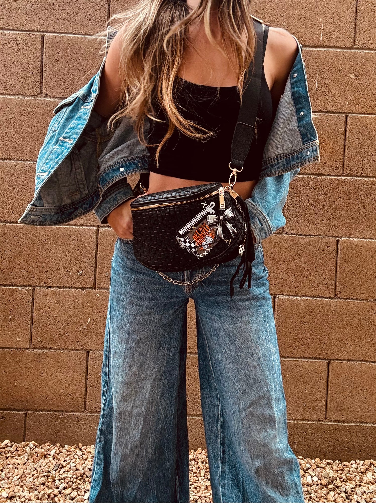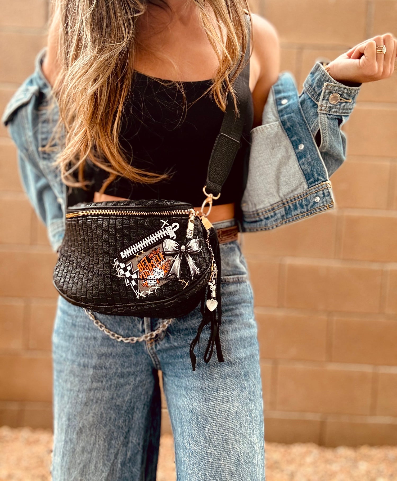 This is The PHOENIX Crossbody Purse. Made with Hugh quality Vegan Woven Leather. All exterior designs, applications and accessories have been Handmade and created by CM CO.
