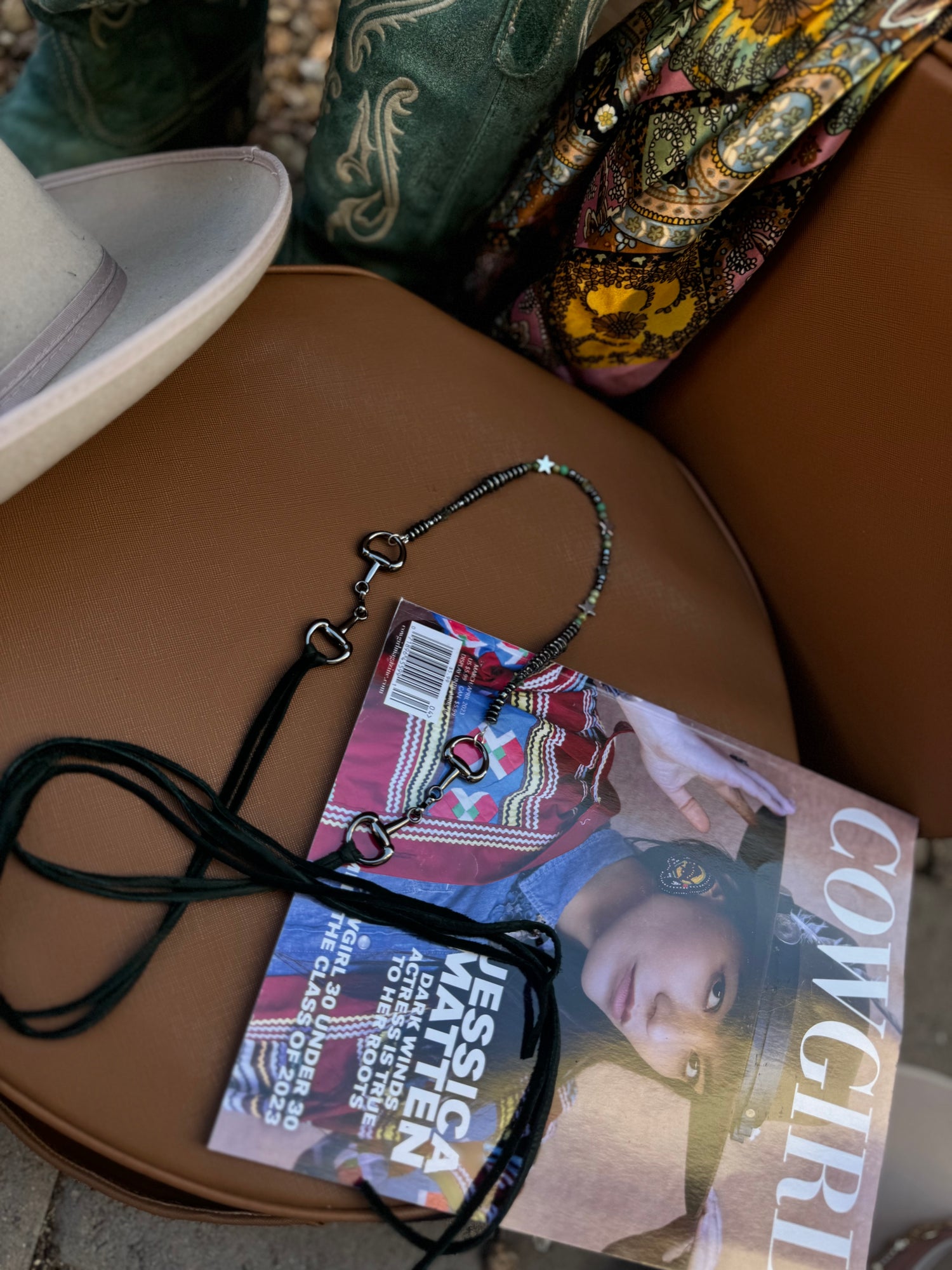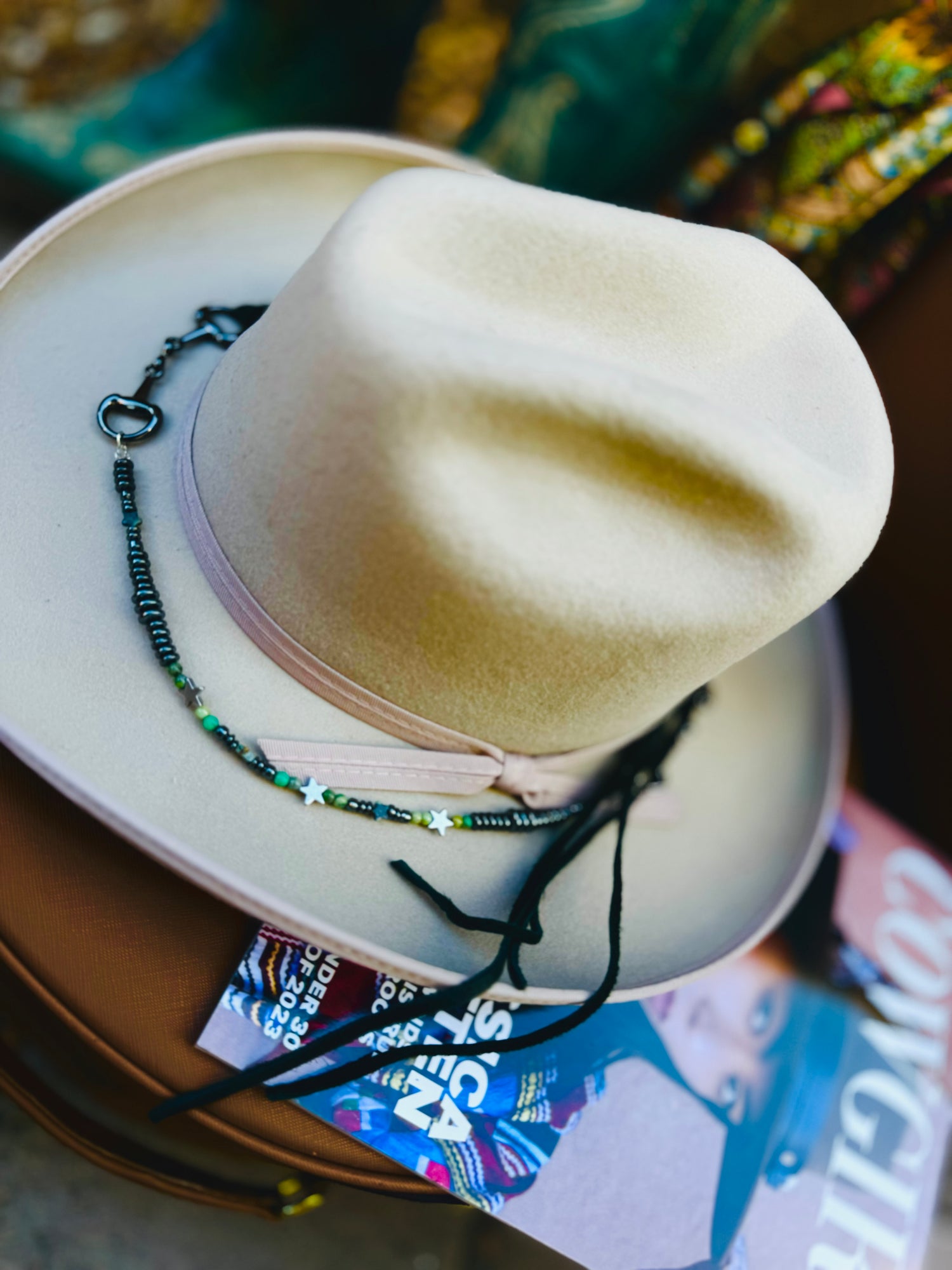 Genuine Handmade Locally sourced Elk hide Hat bands. Beaded and designed by CM Co. Made with Snaffle Bit and Rare Deep Emerald green elk hide