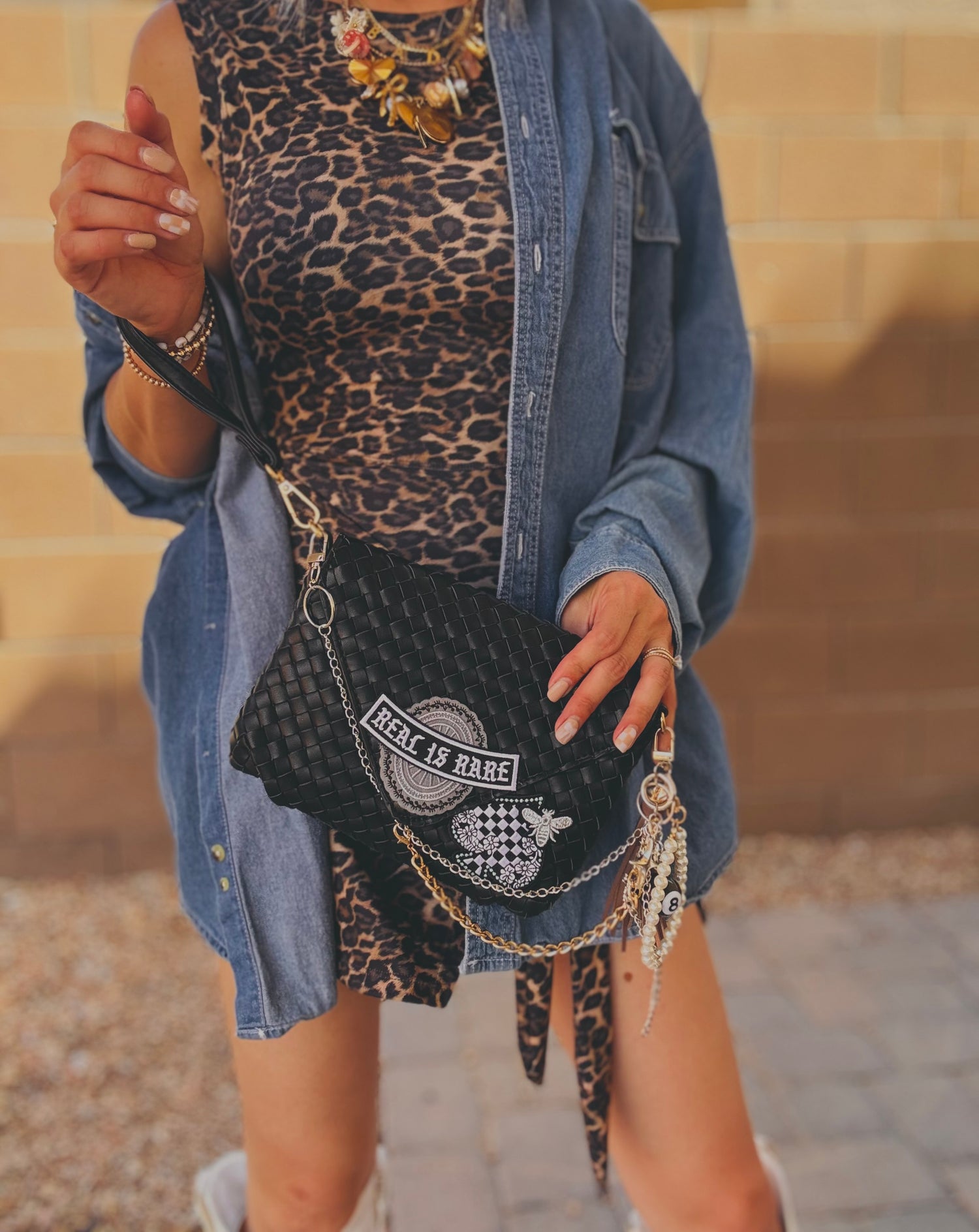 This is The Winslow Purse. Made with High quality Vegan Woven Leather. All exterior designs, applications and accessories have been Handmade and created by CM CO.