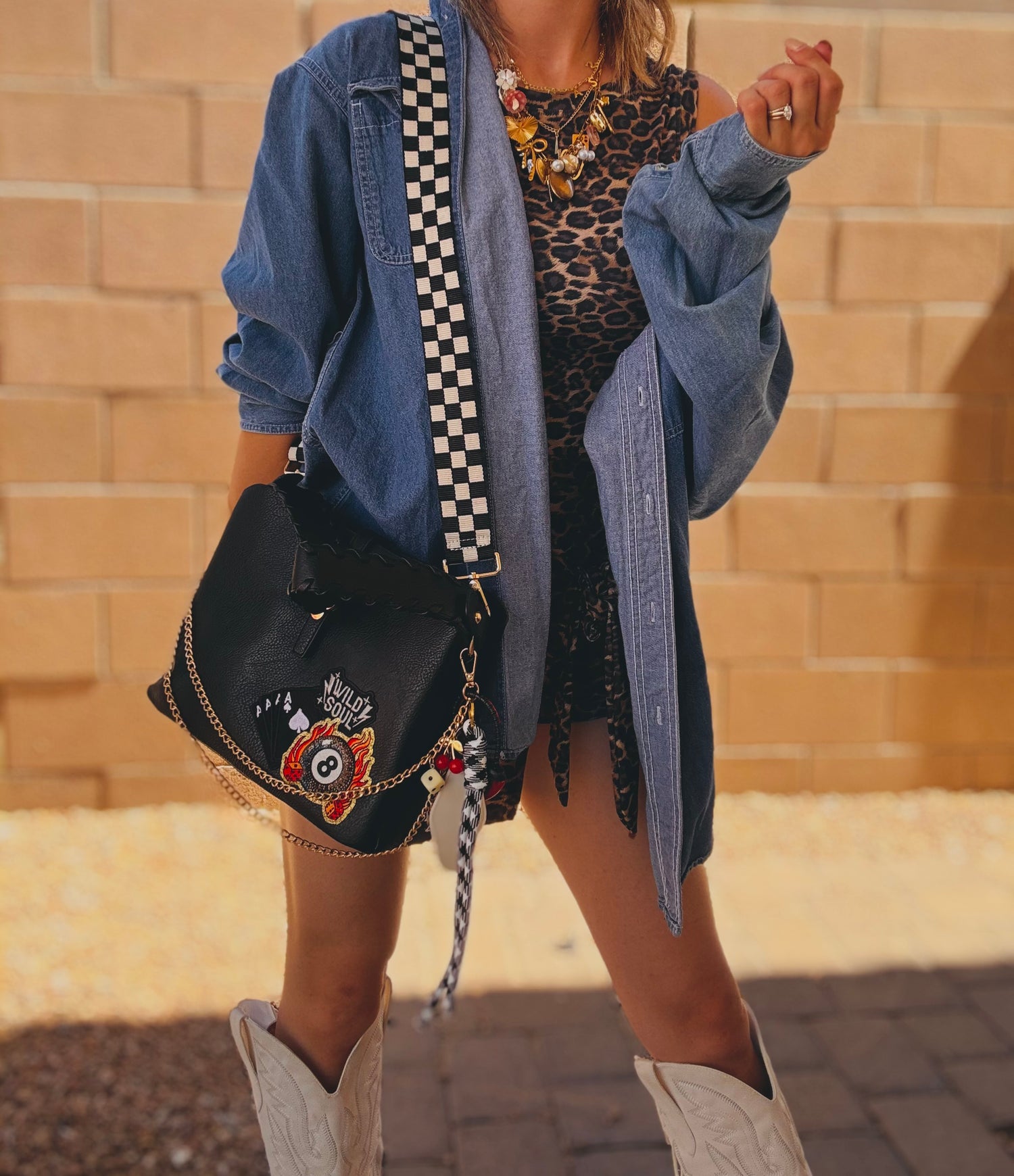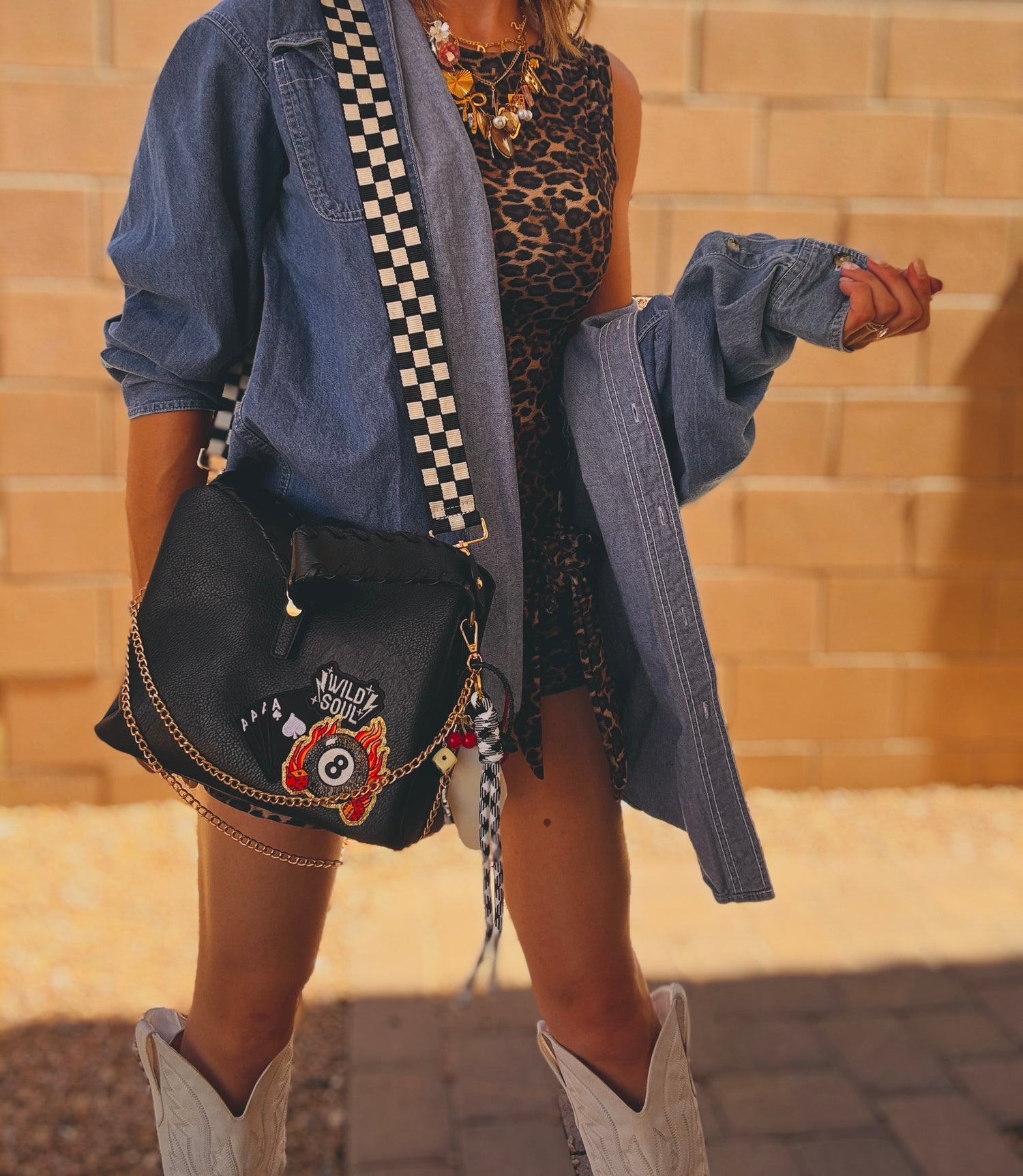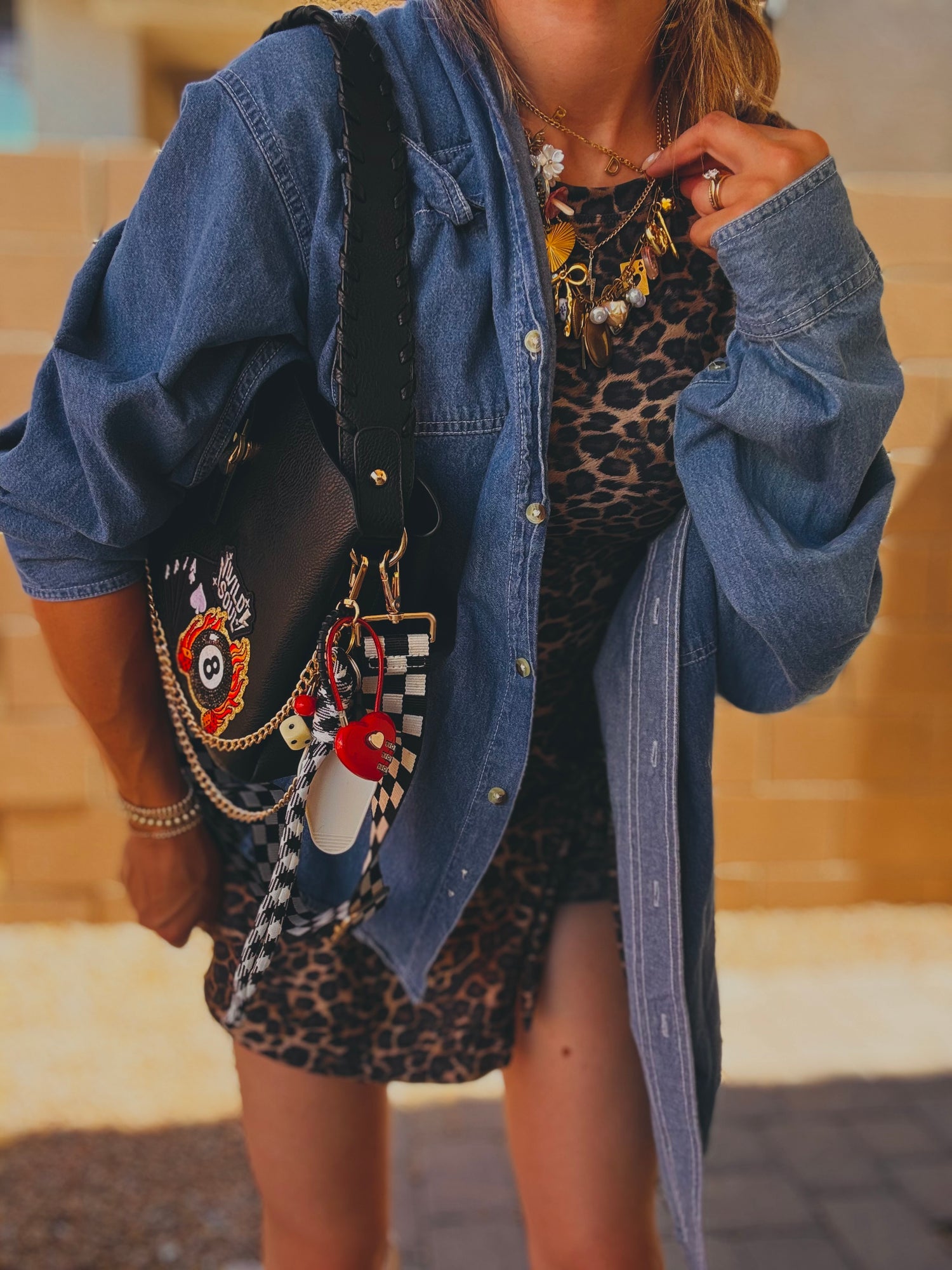 THIS IS A HANDMADE APPLICATION. ALL ITEMS ADDED TO THE BAGS ARE OF A RAW AND NATURAL MATERIAL. ALL CHARMS AND ACCESSORIES ARE FOR LOOK PURPOSES NOT USE AND SHOULD BE USED AND WOEN WITH EXTRA CARE! PLEASE SEE CARE CARDS AND FOLLOW CARE AND USE INSTRUCTIONS