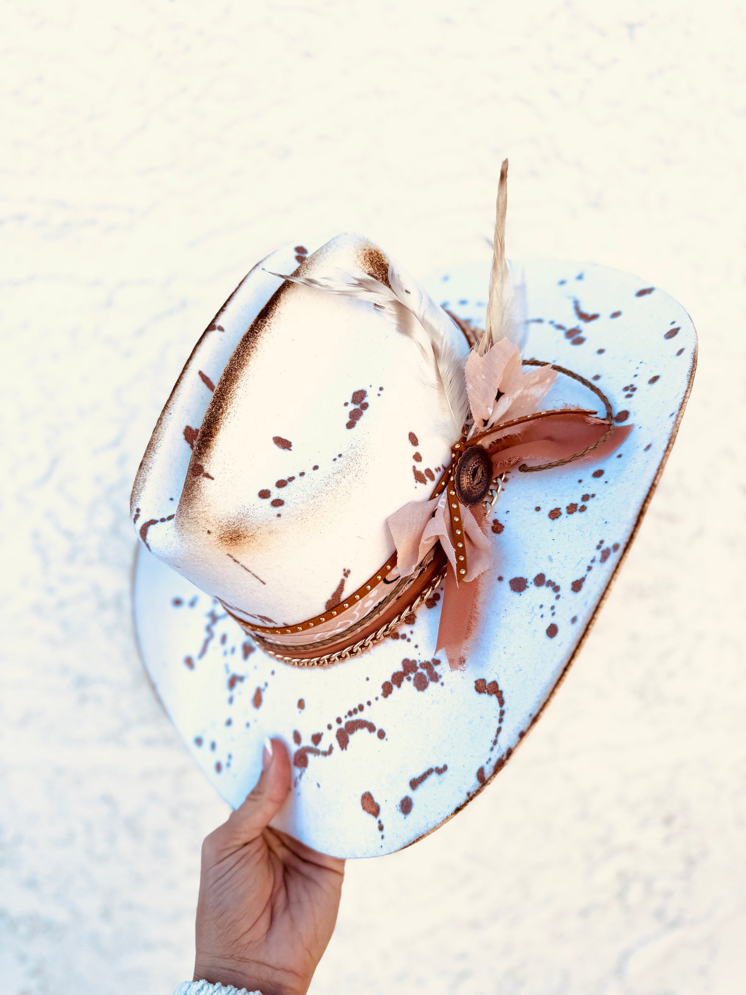We have hand splattered dyed This gorgeous ivory hat to give it a beautiful and sophisticated look. she features lavish details and accessories that combine in a beautiful desert Copper feel. She is a one of a kind stunner! m
