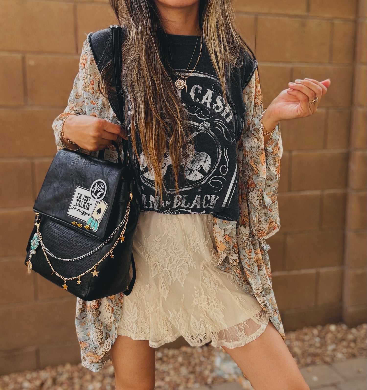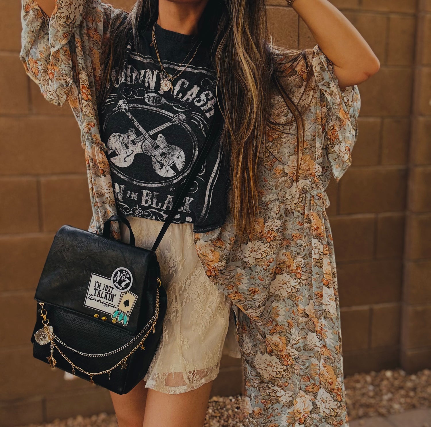 THIS IS A HANDMADE APPLICATION. ALL ITEMS ADDED TO THE BAGS ARE OF A RAW AND NATURAL MATERIAL. ALL CHARMS AND ACCESSORIES ARE FOR LOOK PURPOSES NOT USE AND SHOULD BE USED AND WOEN WITH EXTRA CARE! PLEASE SEE CARE CARDS AND FOLLOW CARE AND USE INSTRUCTIONS