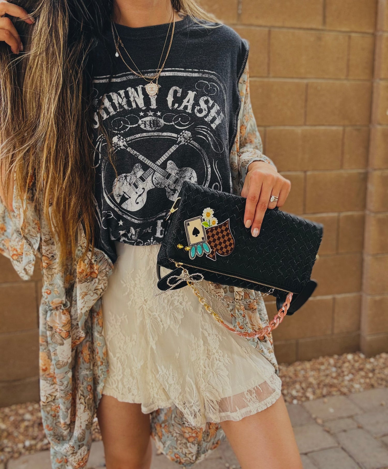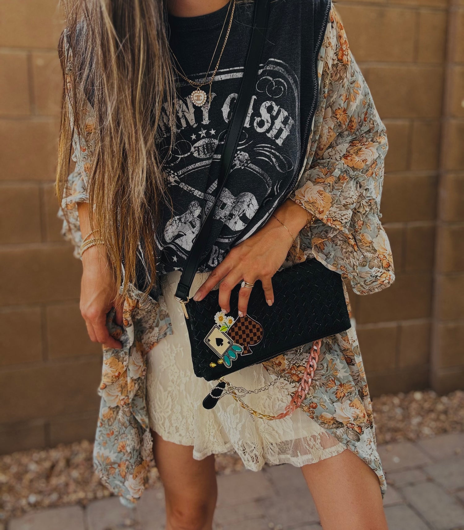 THIS IS A HANDMADE APPLICATION. ALL ITEMS ADDED TO THE BAGS ARE OF A RAW AND NATURAL MATERIAL. ALL CHARMS AND ACCESSORIES ARE FOR LOOK PURPOSES NOT USE AND SHOULD BE USED AND WOEN WITH EXTRA CARE! PLEASE SEE CARE CARDS AND FOLLOW CARE AND USE INSTRUCTIONS