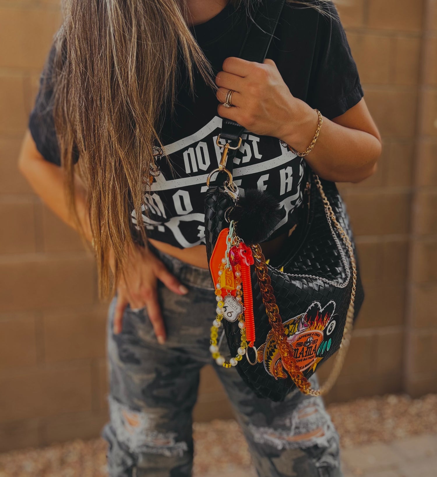 THIS IS A HANDMADE APPLICATION. ALL ITEMS ADDED TO THE BAGS ARE OF A RAW AND NATURAL MATERIAL. ALL CHARMS AND ACCESSORIES ARE FOR LOOK PURPOSES NOT USE AND SHOULD BE USED AND WOEN WITH EXTRA CARE! PLEASE SEE CARE CARDS AND FOLLOW CARE AND USE INSTRUCTIONS
