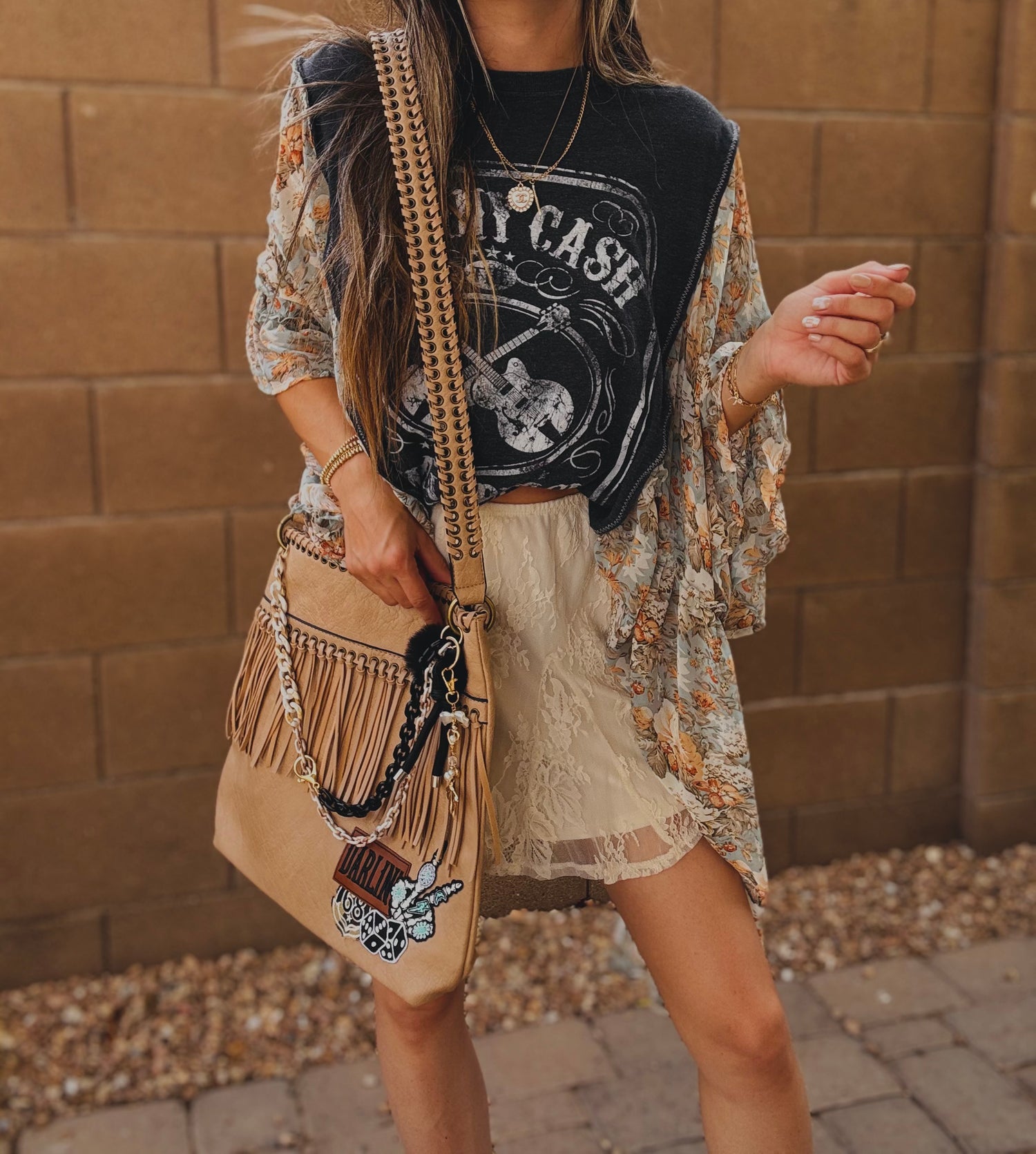 THIS IS A HANDMADE APPLICATION. ALL ITEMS ADDED TO THE BAGS ARE OF A RAW AND NATURAL MATERIAL. ALL CHARMS AND ACCESSORIES ARE FOR LOOK PURPOSES NOT USE AND SHOULD BE USED AND WOEN WITH EXTRA CARE! PLEASE SEE CARE CARDS AND FOLLOW CARE AND USE INSTRUCTIONS