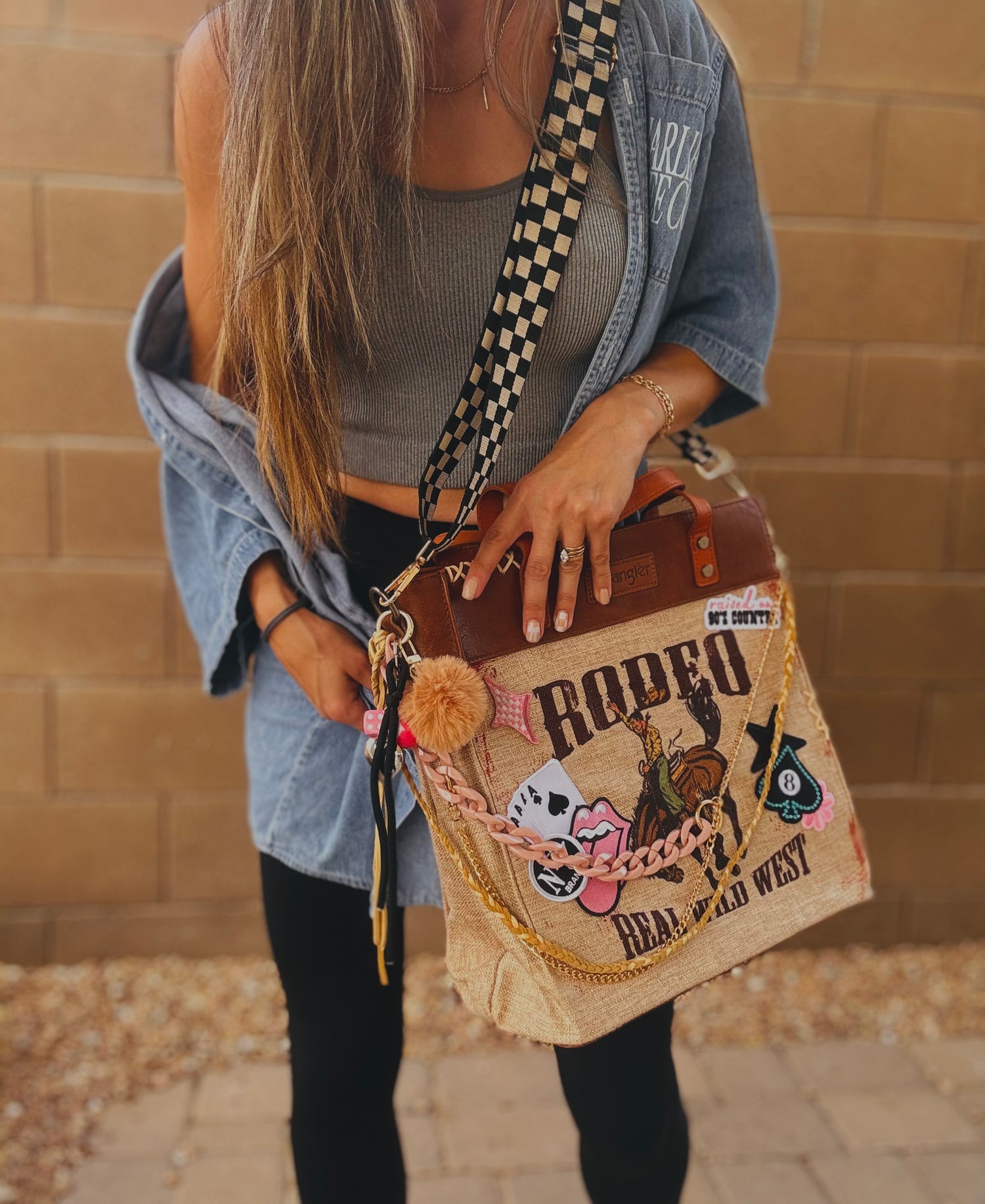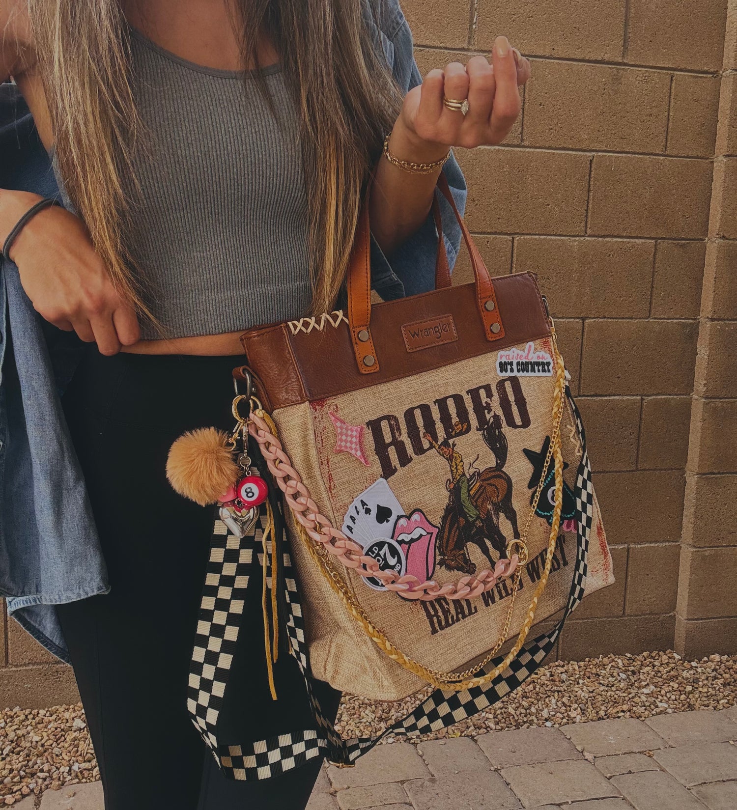 this is a wrangler Crossbody bag that we have given our own twist too! Repurposing a beautiful bag and making it a one-of-a-kind piece. She is brand new and ready to be worn.