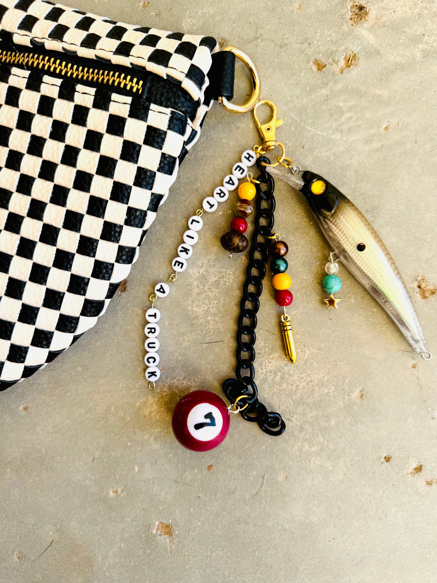 Authentic poker chip, fishing lure,ammo casings, guitar picks all hand beaded.