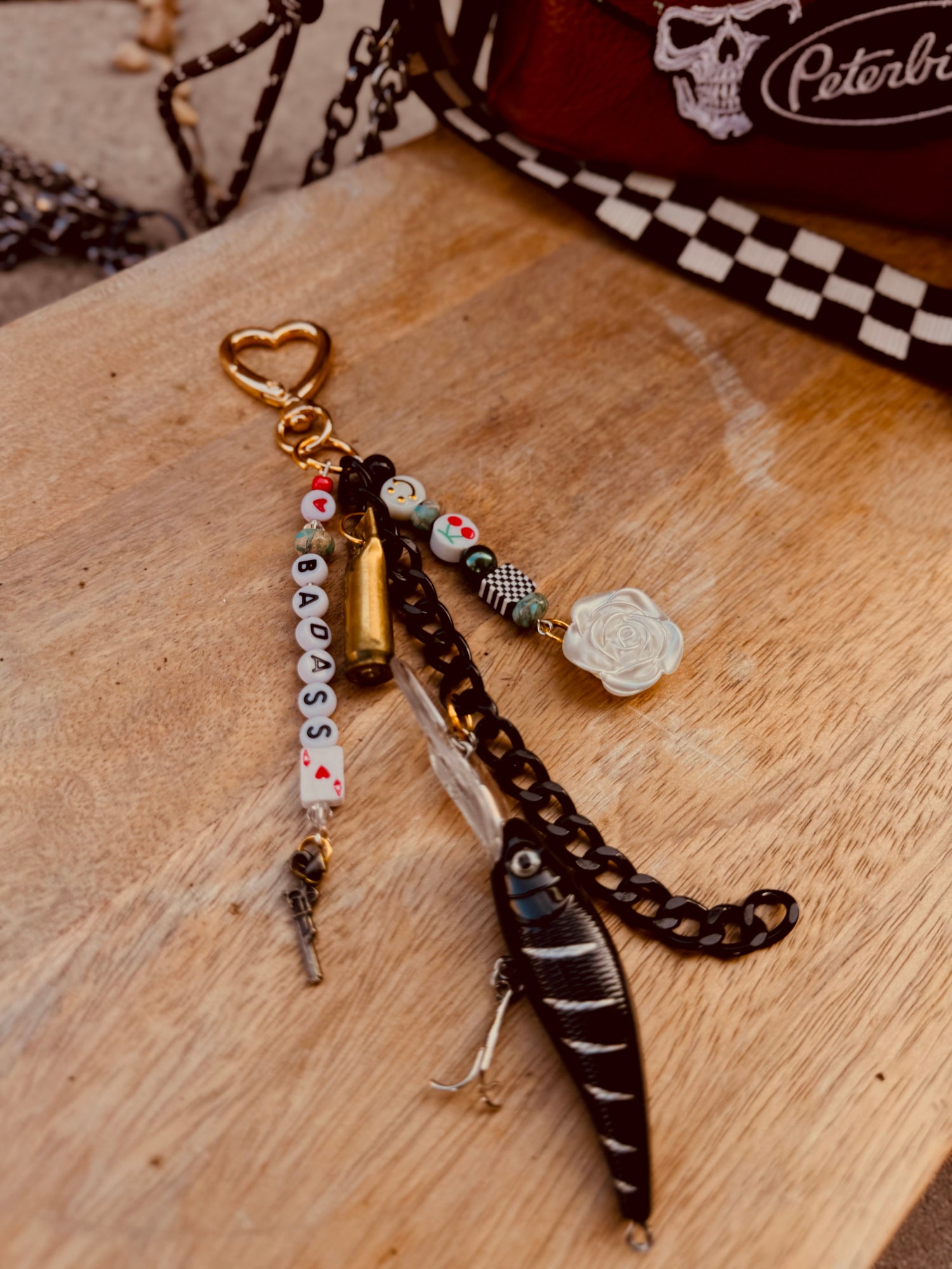 Authentic poker chip, fishing lure,ammo casings, guitar picks all hand beaded.