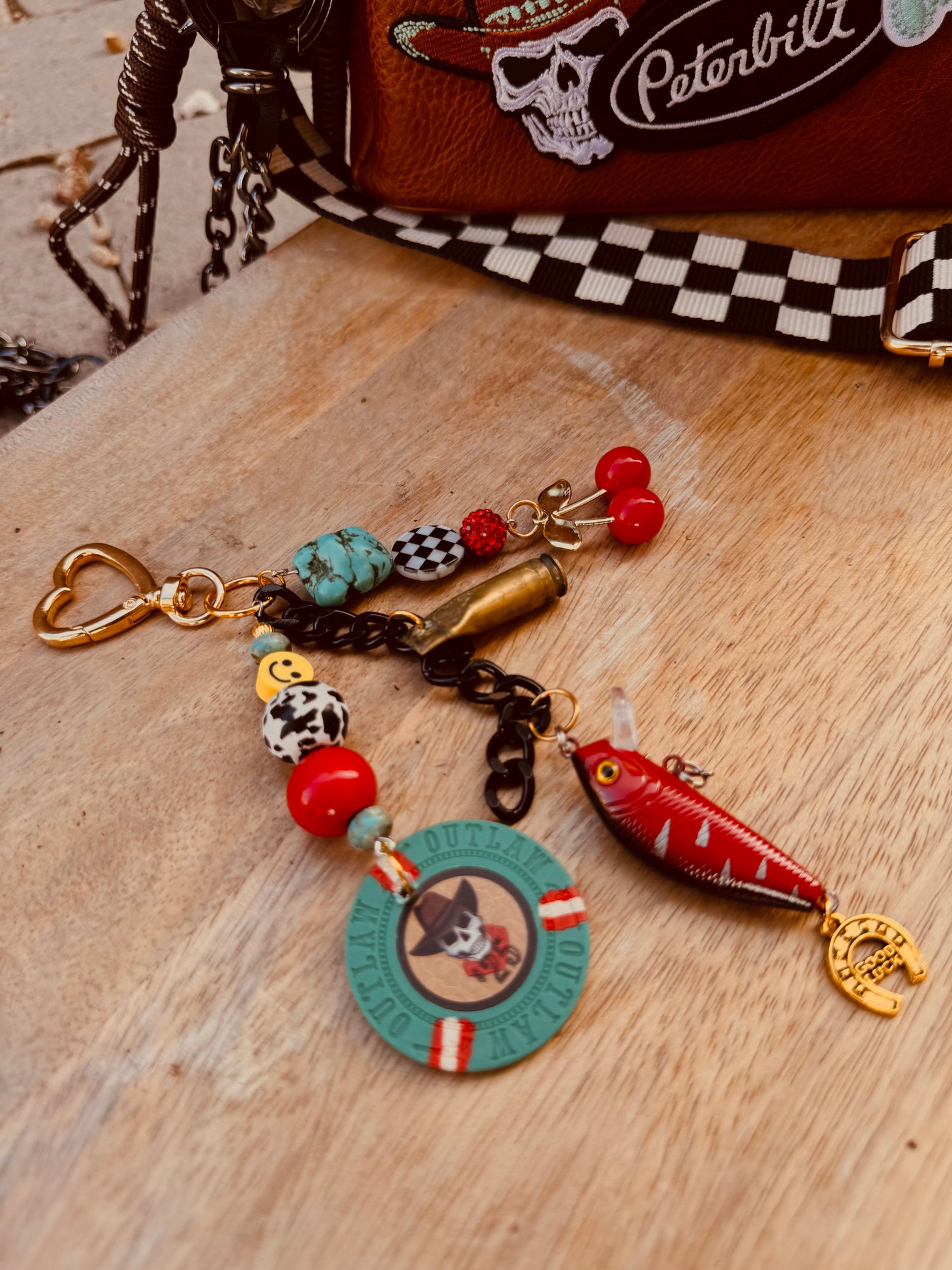 Authentic poker chip, fishing lure,ammo casings, guitar picks all hand beaded.