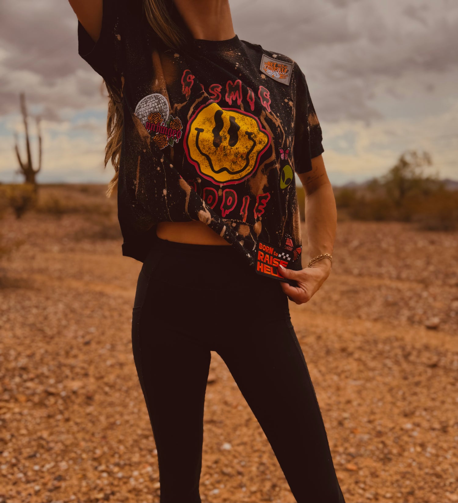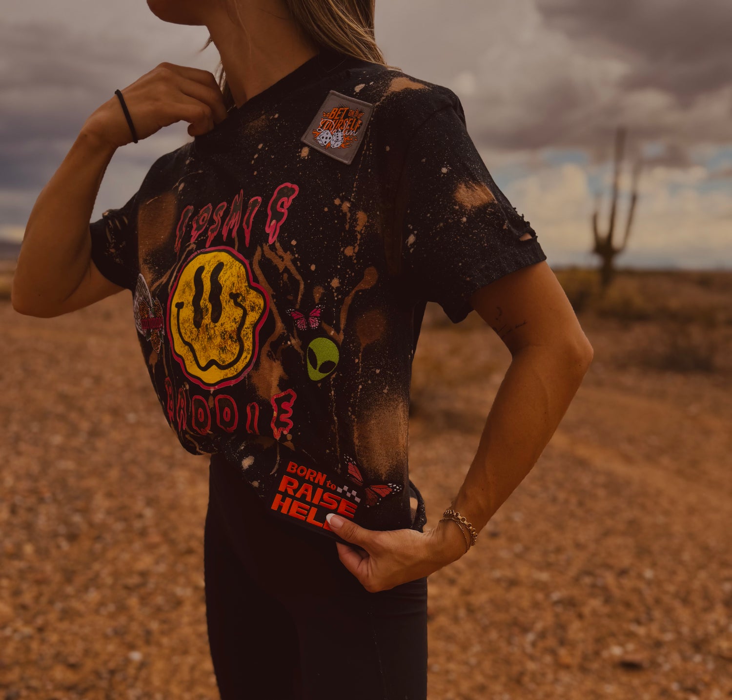 All of our Vintage TShirts are one of a kind. They are vintage washed, distressed and cut. They have a slouchy fit and feel. They are in-between a crop and regular tshirt fit. We like to wear ours one size up for a slouchy look and tuck. All tshirts have a main front panel printed design plus Multiple patches sew on around the shirt.