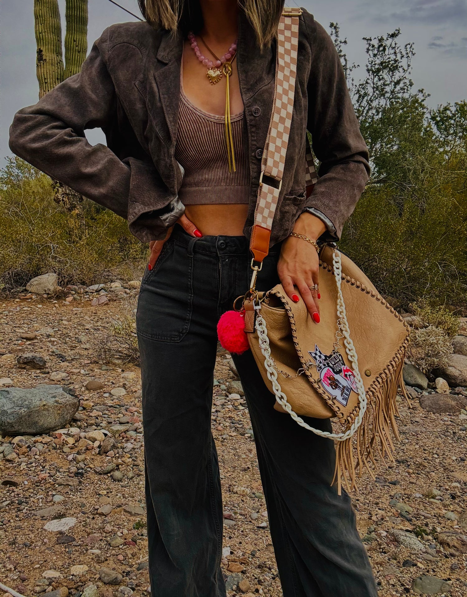 THIS IS A HANDMADE APPLICATION. ALL ITEMS ADDED TO THE BAGS ARE OF A RAW AND NATURAL MATERIAL. ALL CHARMS AND ACCESSORIES ARE FOR LOOK PURPOSES NOT USE AND SHOULD BE USED AND WOEN WITH EXTRA CARE! PLEASE SEE CARE CARDS AND FOLLOW CARE AND USE INSTRUCTIONS