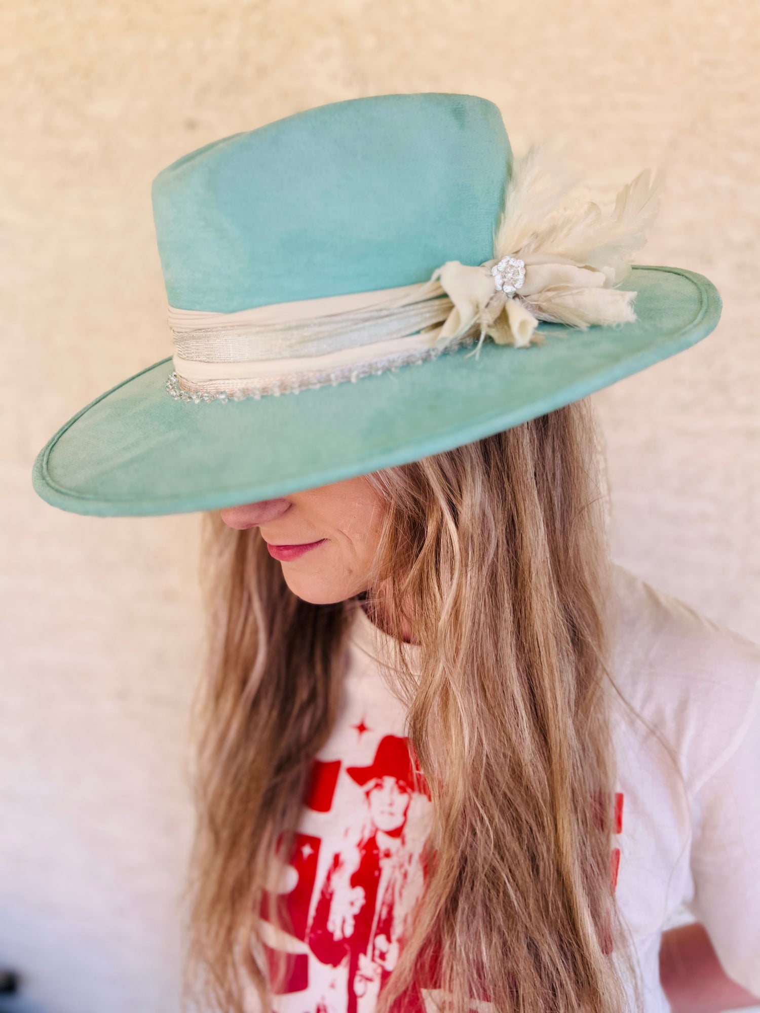 This one of a kind Charlie Maree Co. hat is made with a mint color vegan suede wide brim in a size medium averaging 56 to 57 cm with a large snug elastic sweatband. Layers of soft ivory, vintage fabric and a crystal chain accompanied by wildflowers.
