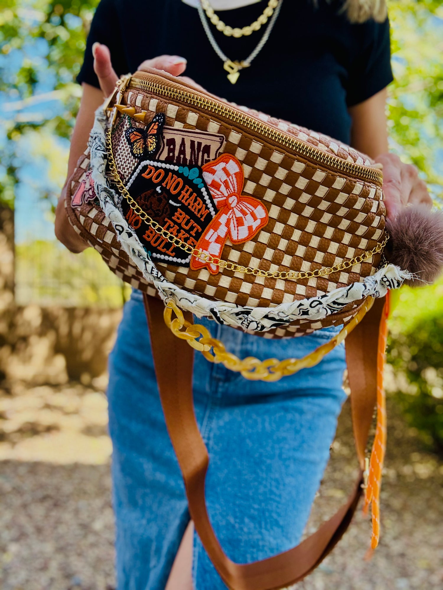 This is The PHOENIX Crossbody Purse. Made with High quality Vegan Woven Leather. All exterior designs, applications and accessories have been Handmade and created by CM CO.