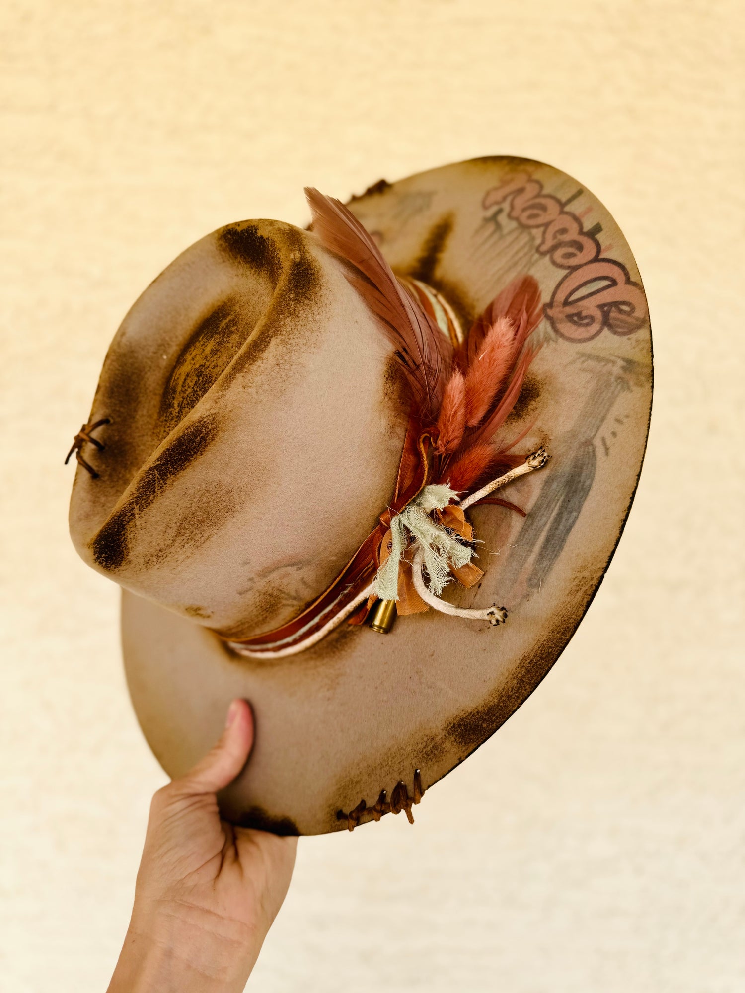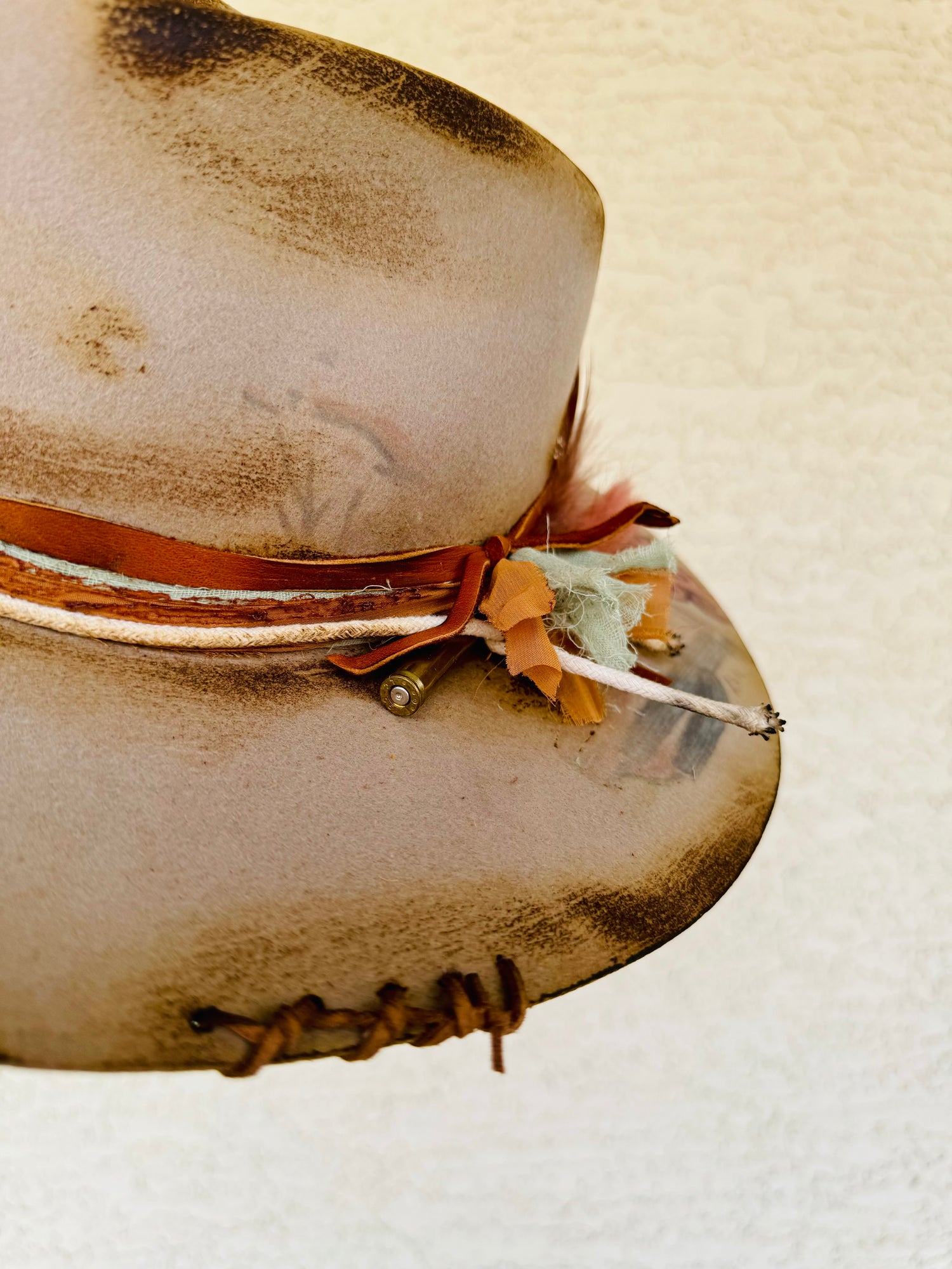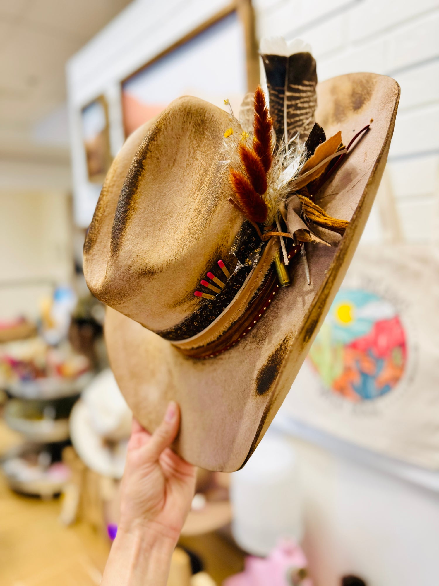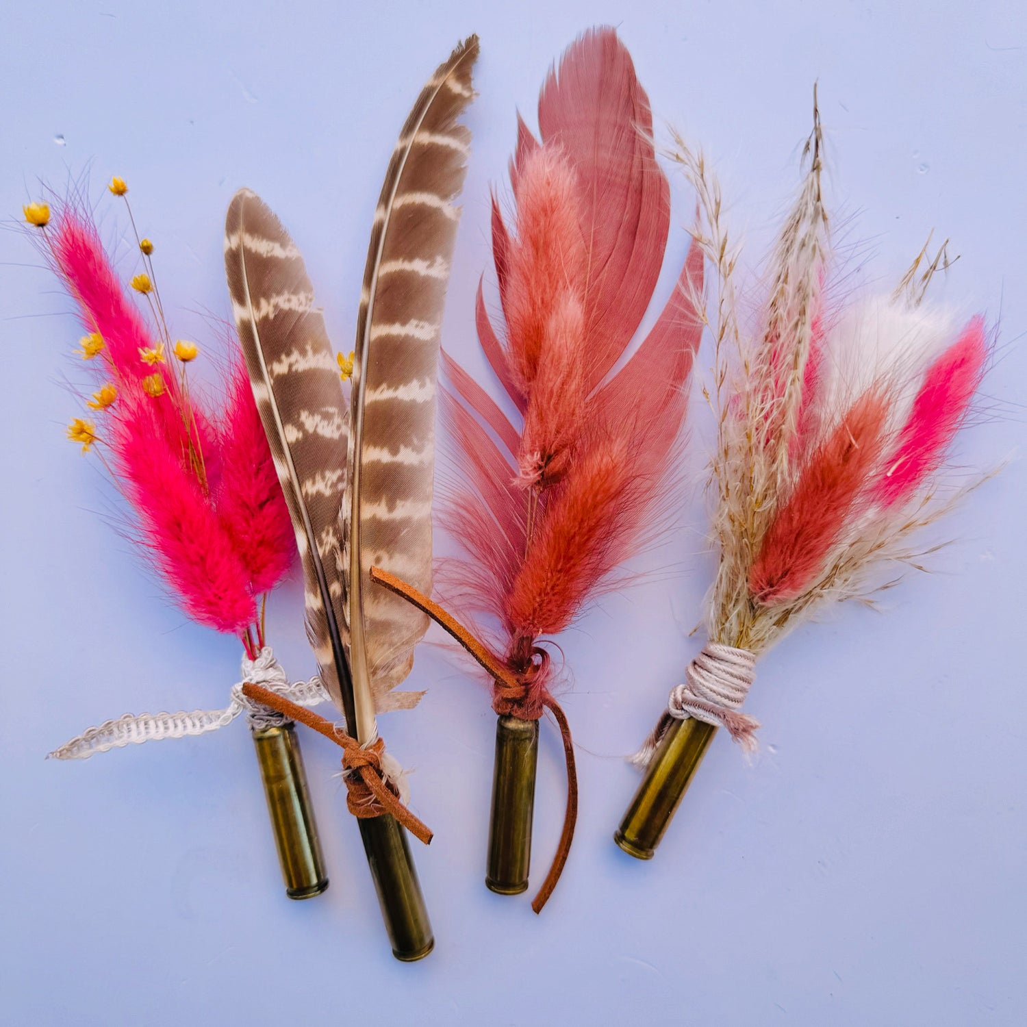 We make hand curated ammo casing accessories that are filled with beautiful natural flowers and feathers wrapped in tied for the perfect hat band upgrade! Just slide our ammo casing into any existing hat that you have to add a unique and fun touch. All of them materials are natural. Our ammo casings are 100% real Metal Riffle casings that have been up cycled!