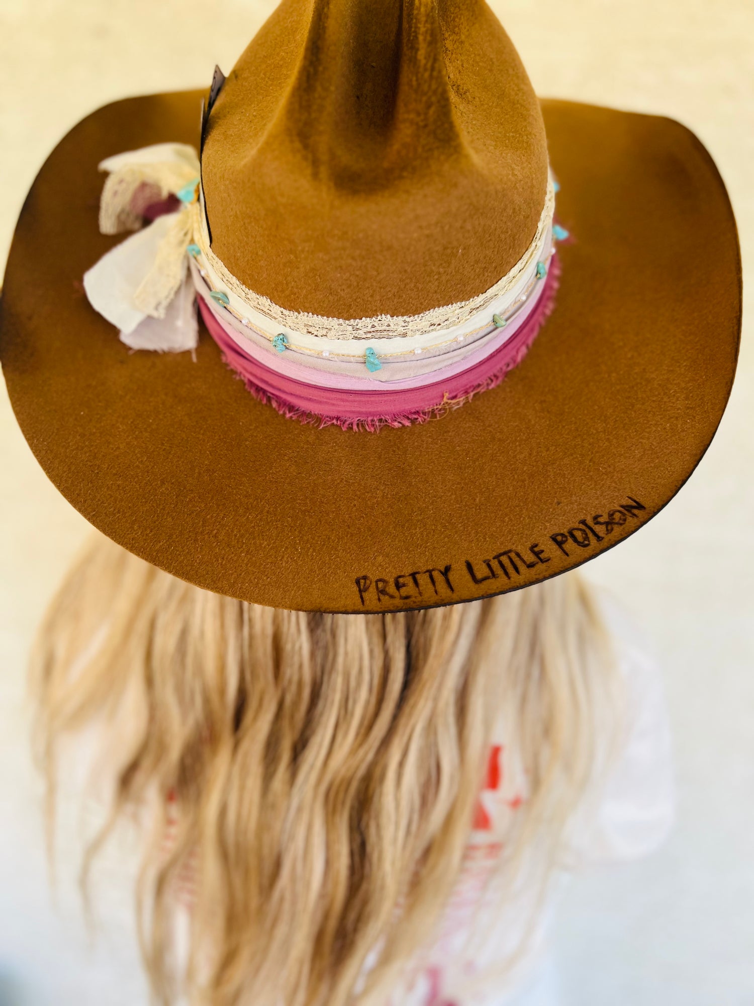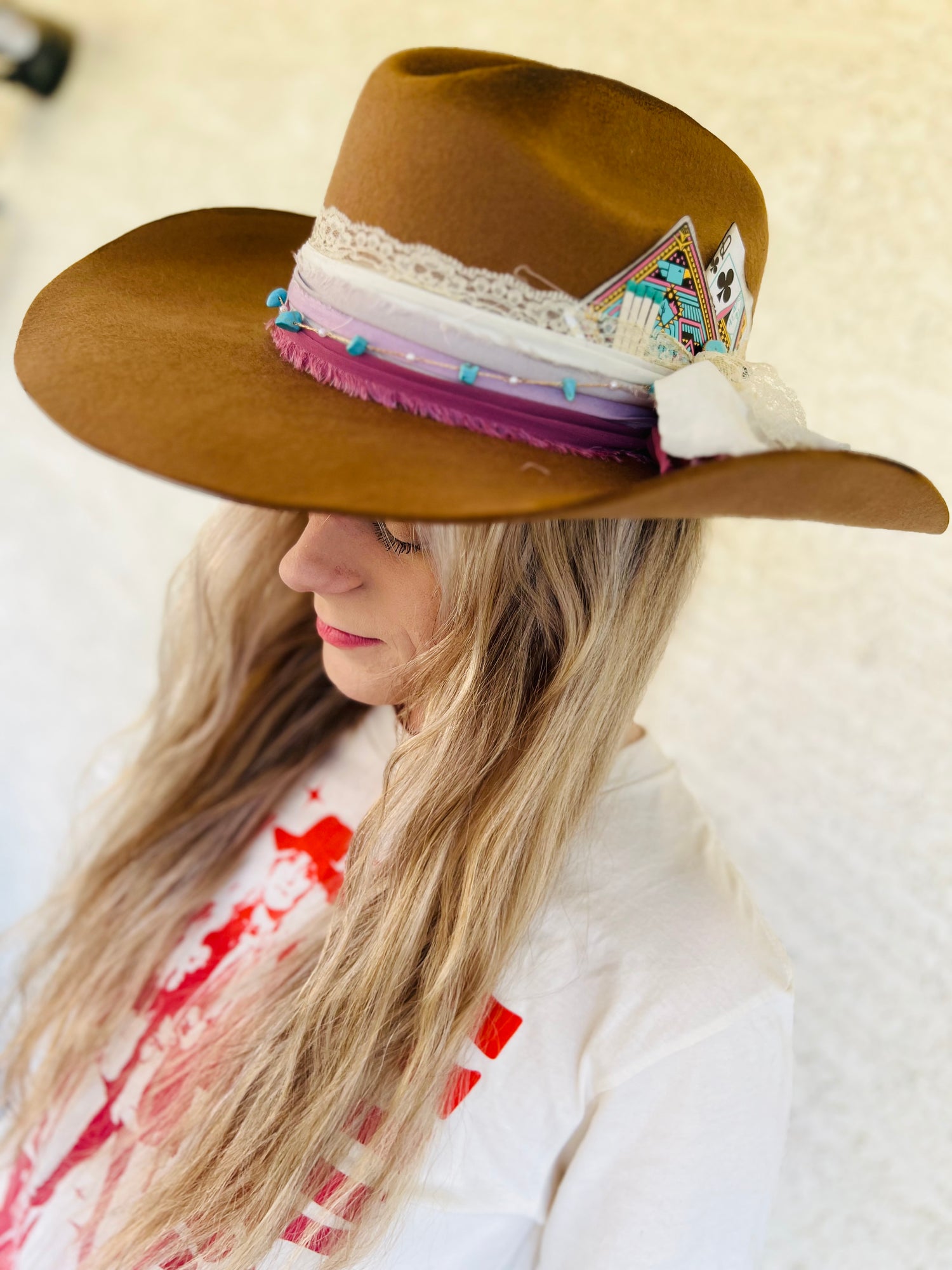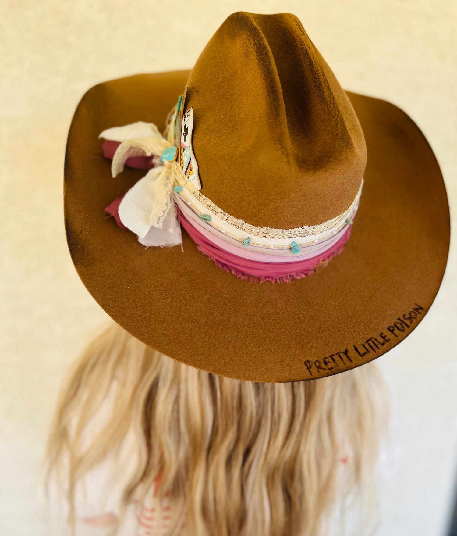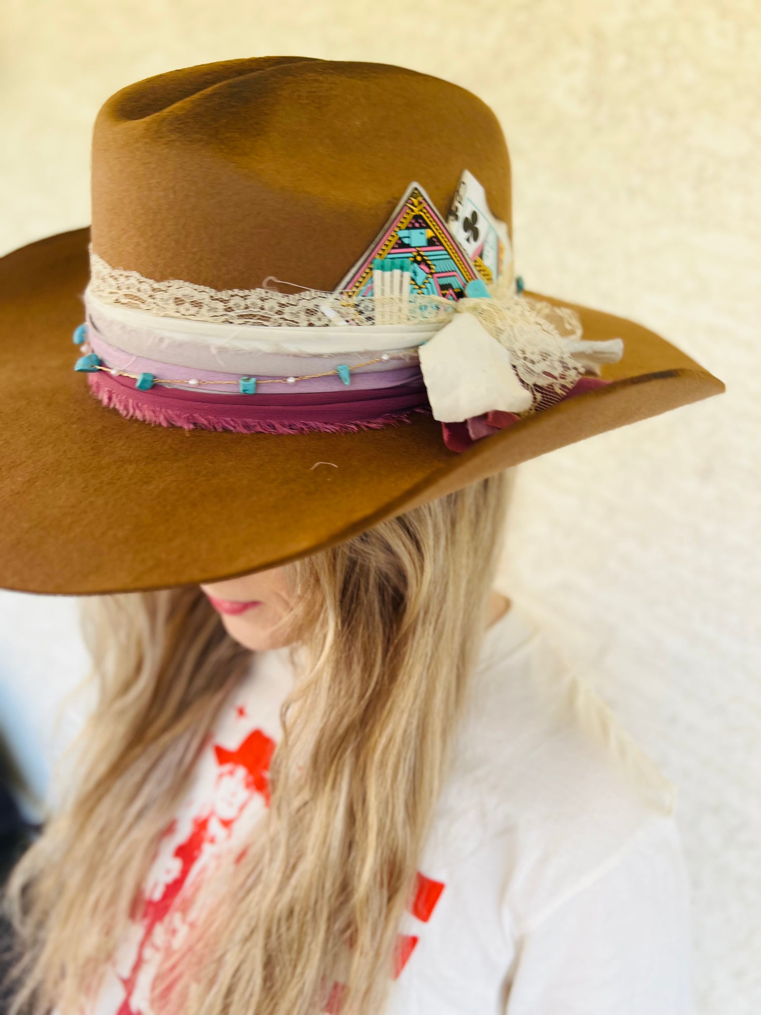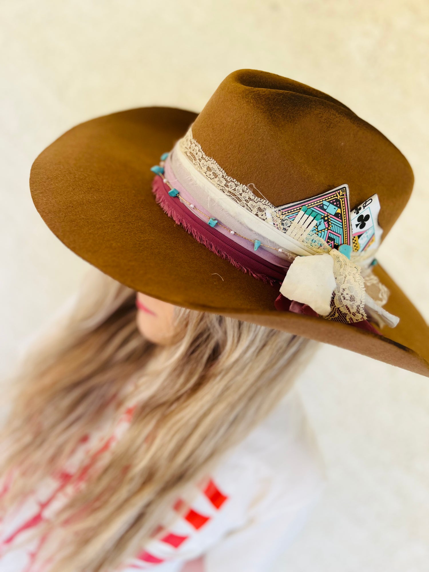 It is a company by layers of vintage fabric a turquoise and pearl chain burn distressing, vintage playing cards, turquoise pin, and a handcrafted burn design lyrics.