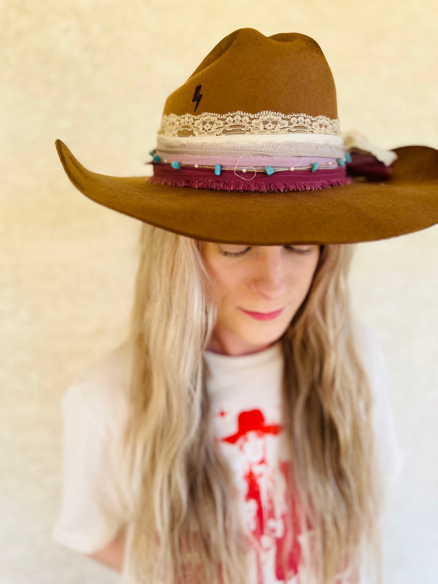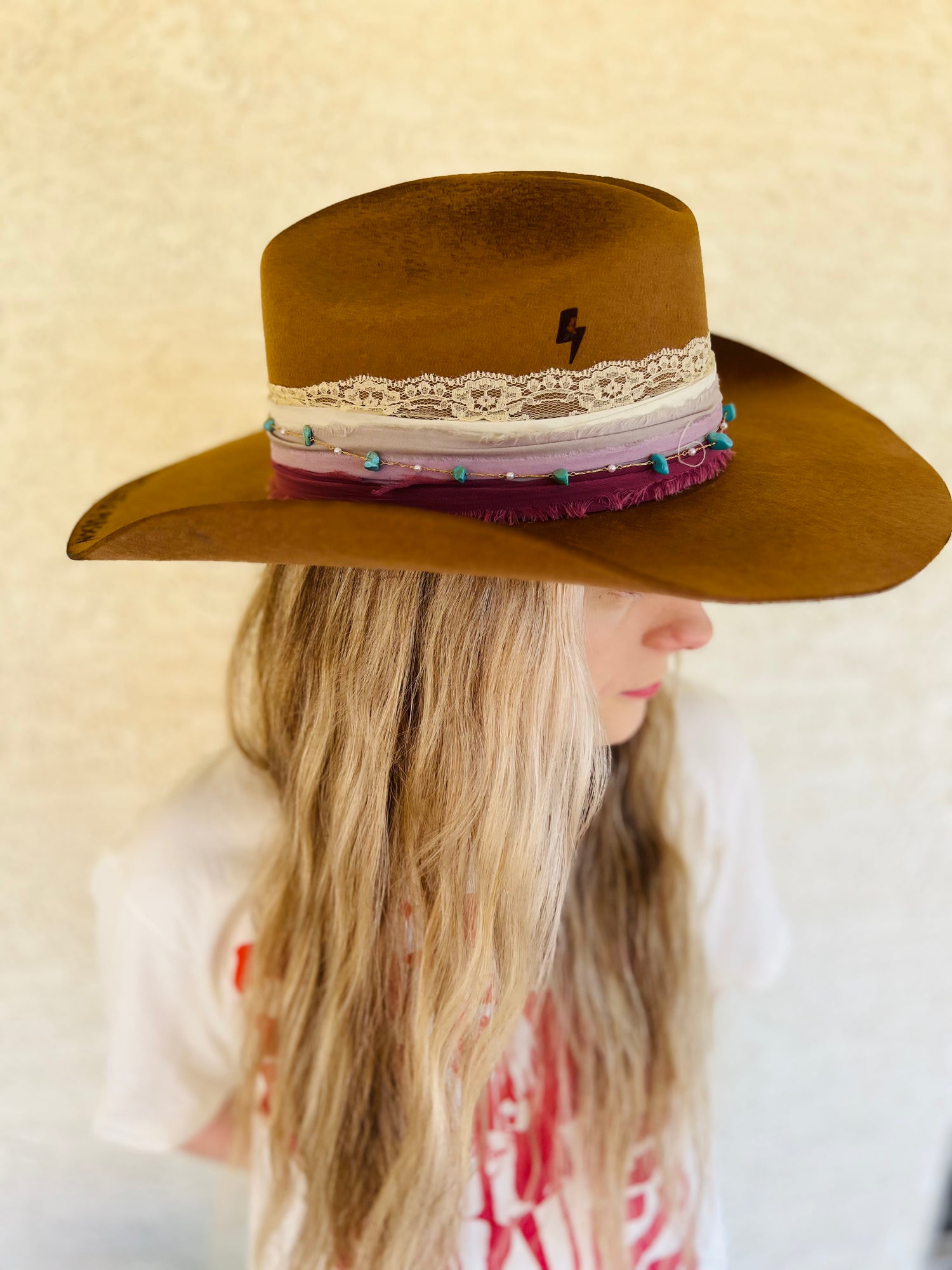 This one of a kind Charlie Maree Co. genuine wool cowgirl hat is a one size fits most adjustable inner sweatband with pool strings. These average anywhere from 55 cm to 58 cm depending on adjustment with band adjusters. Please note that this is a 100% genuine wool hat that will need to be shaped and steamed on a regular regular basis to keep its shape.