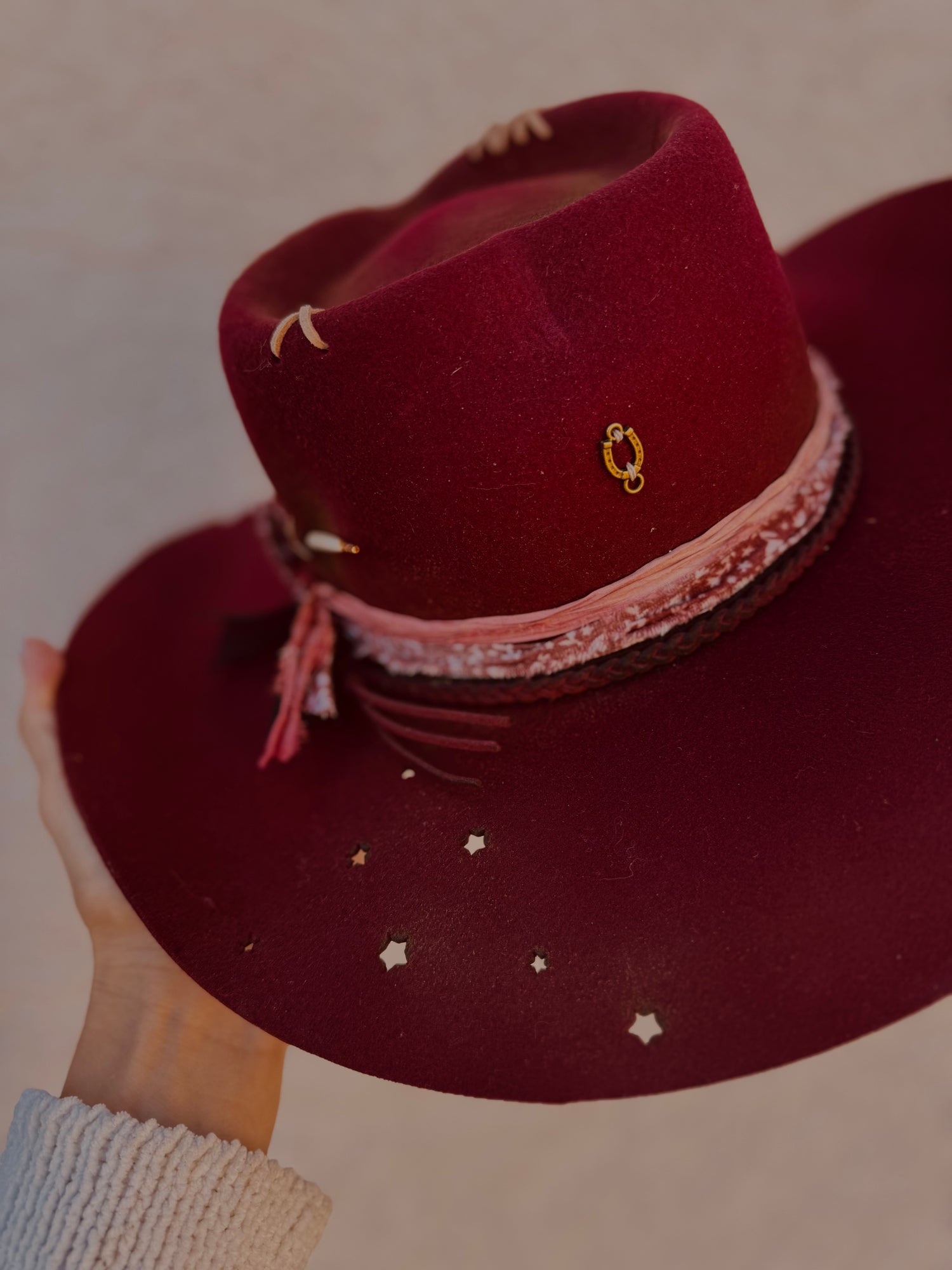 This sweetheart shaped crown felt cowgirl. Brim is one of a kind. It’s gorgeous Merlot red color is stunning in person. Every detail, stitched, and uniquely shaped piece adds to this hat.