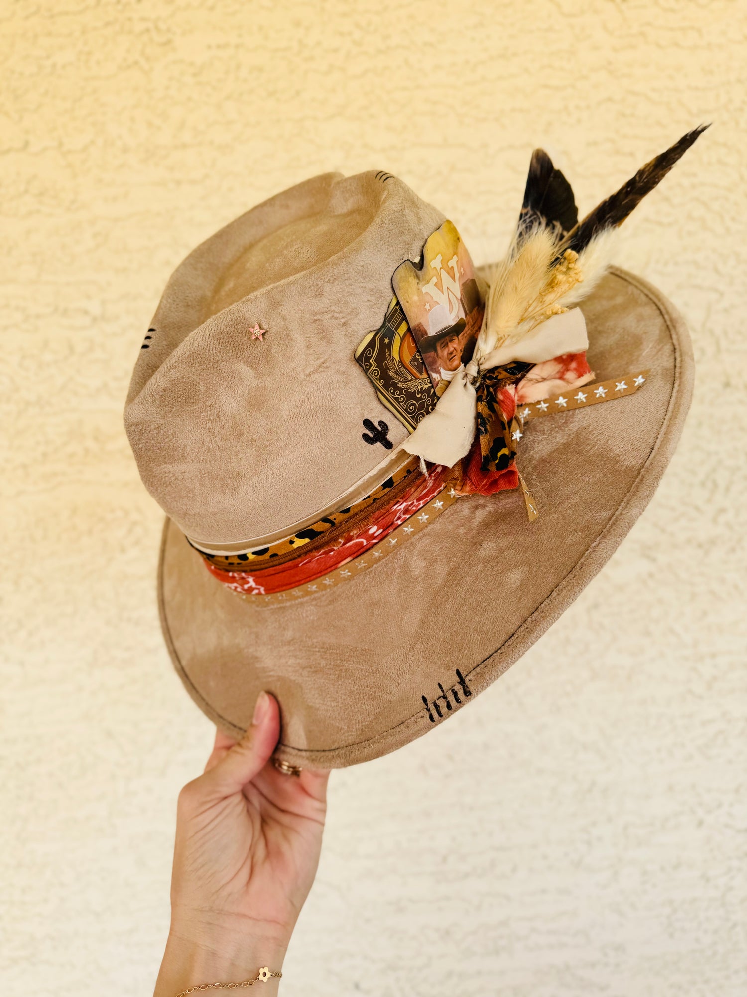 Limited edition sweetheart crown hat with a rancher dipped down front brim. Made of vegan suede