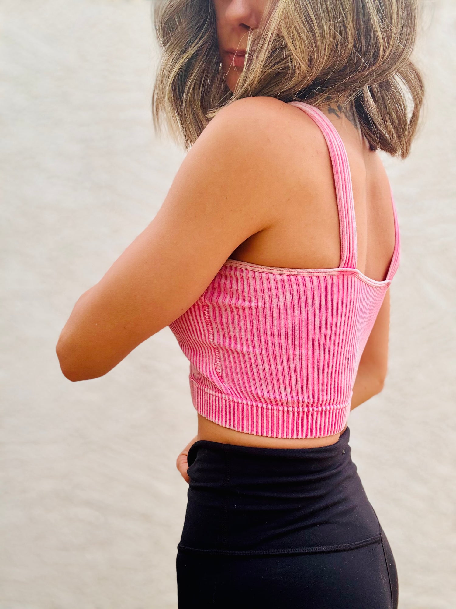 A premium washed ribbed seamless bralette tank with built-in bra coverage and removable bra inserts.