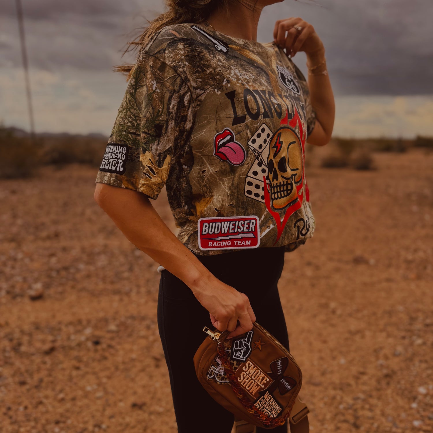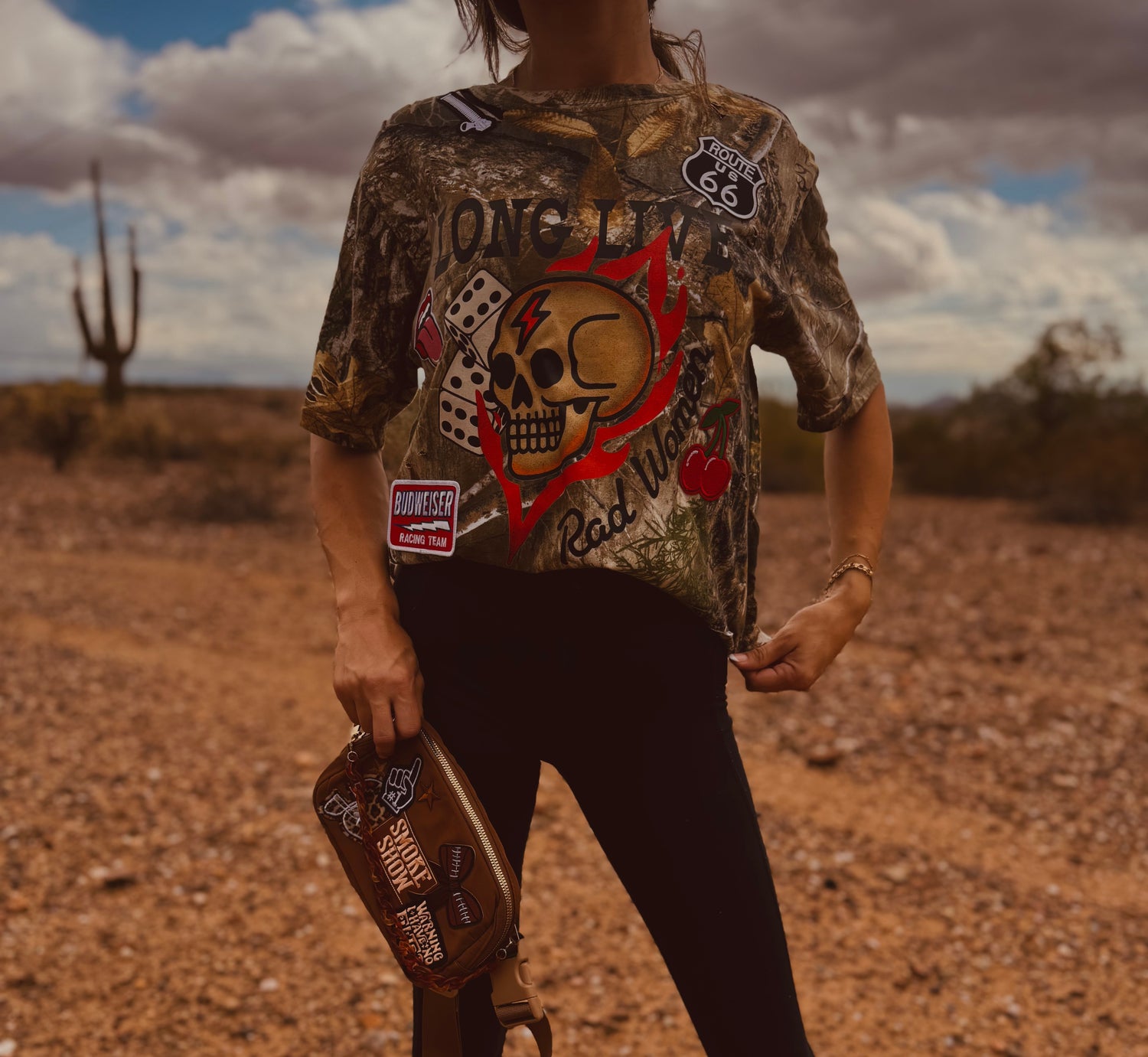 All of our Vintage TShirts are one of a kind. They are vintage washed, distressed and cut. They have a slouchy fit and feel. They are in-between a crop and regular tshirt fit. We like to wear ours one size up for a slouchy look and tuck. All tshirts have a main front panel printed design plus Multiple patches sew on around the shirt.